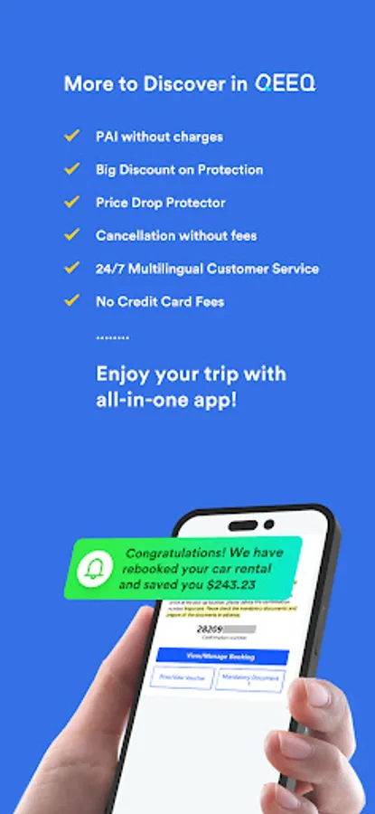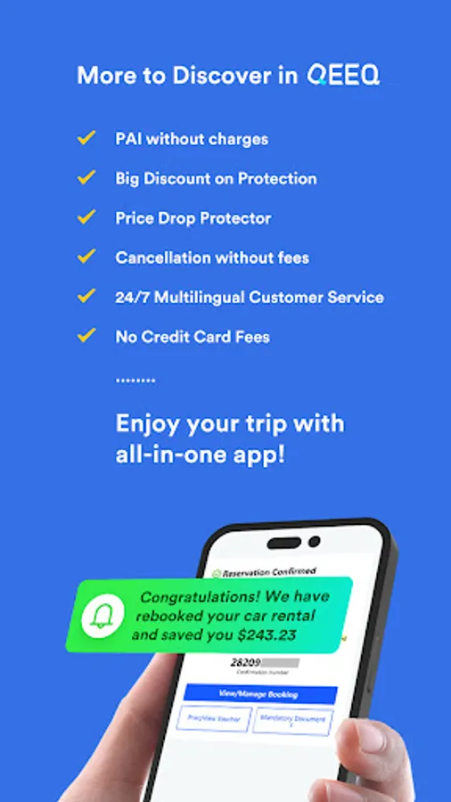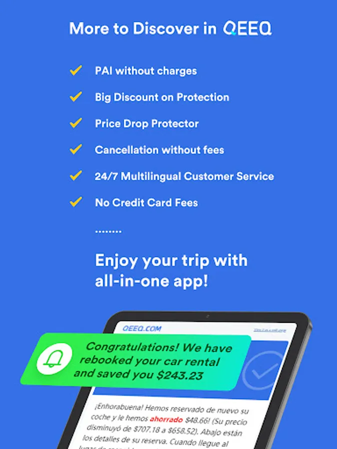 Download QEEQ APP to get the great travel deals on car hire and hotels. Want to start a Roadtrip? Going on Vacations? Tired of searching and comparing prices between different travel apps? Using QEEQ, just with few taps in one stop: search, select, book and pay for a lowest price that you cannot imagine!