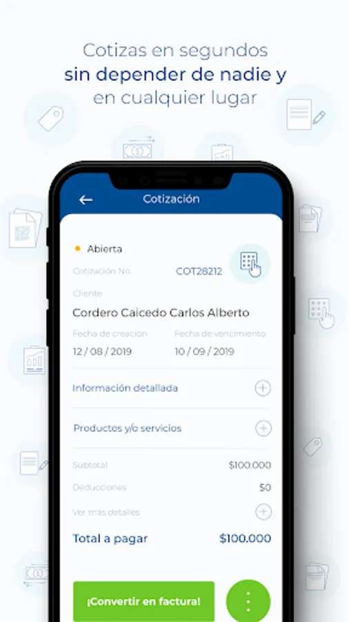 Our application complies with the new requirement of prior validation requested by the DIAN for the issuance of electronic invoices. With Q · enta you will be able to generate electronic invoices as easy as sending an email on your cell phone.