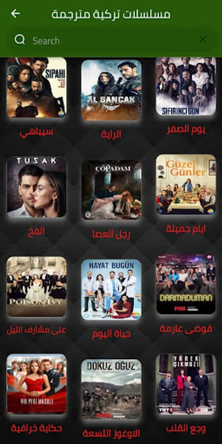 The first section is Turkish series with subtitles that are currently being shown, and Turkish series with subtitles that have ended previously, and the second section is dubbed Turkish series that are currently being shown, and Turkish series with dubbing that have ended previously.