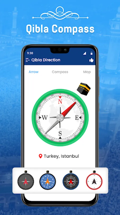· An arrow on the compass & map that shows the (القبلة) qibla direction, which makes it easy for users to determine the qibla direction with qibla compass (direction of the Kaaba in Mecca).
