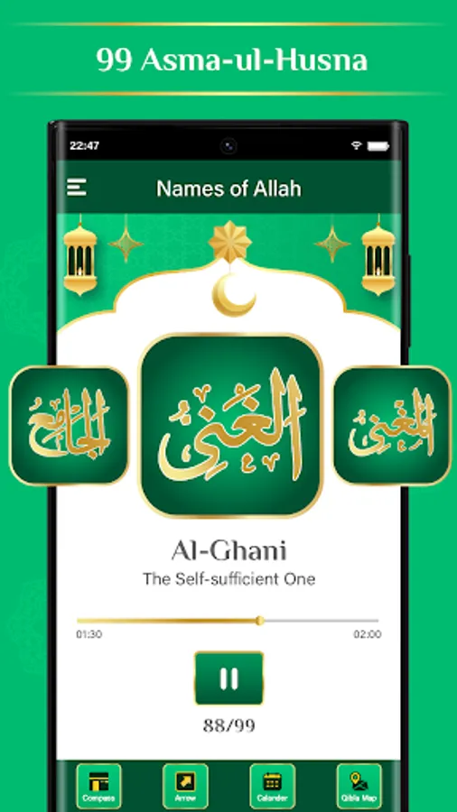Allah Names: Asma Ul Husna list of 99 names of Allah, along with audio and translation in English, to help users.