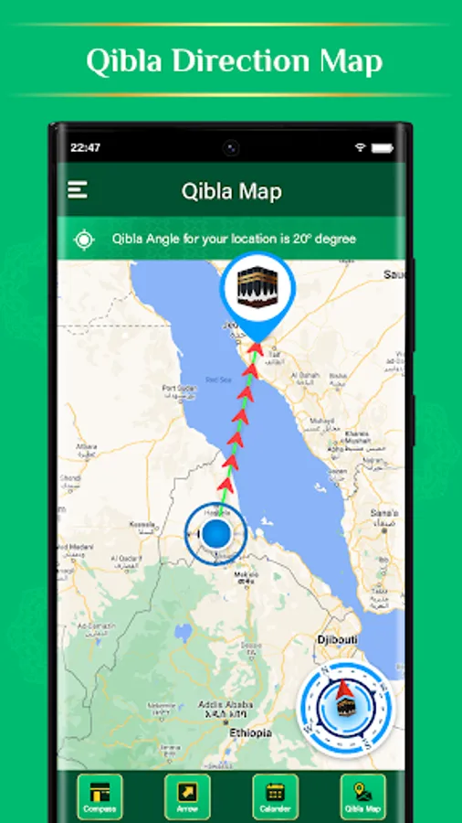 Qibla Map: A map view that shows the user's location and the direction of the Kaaba.