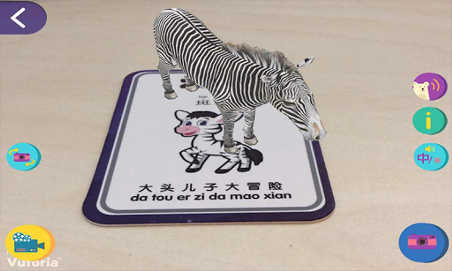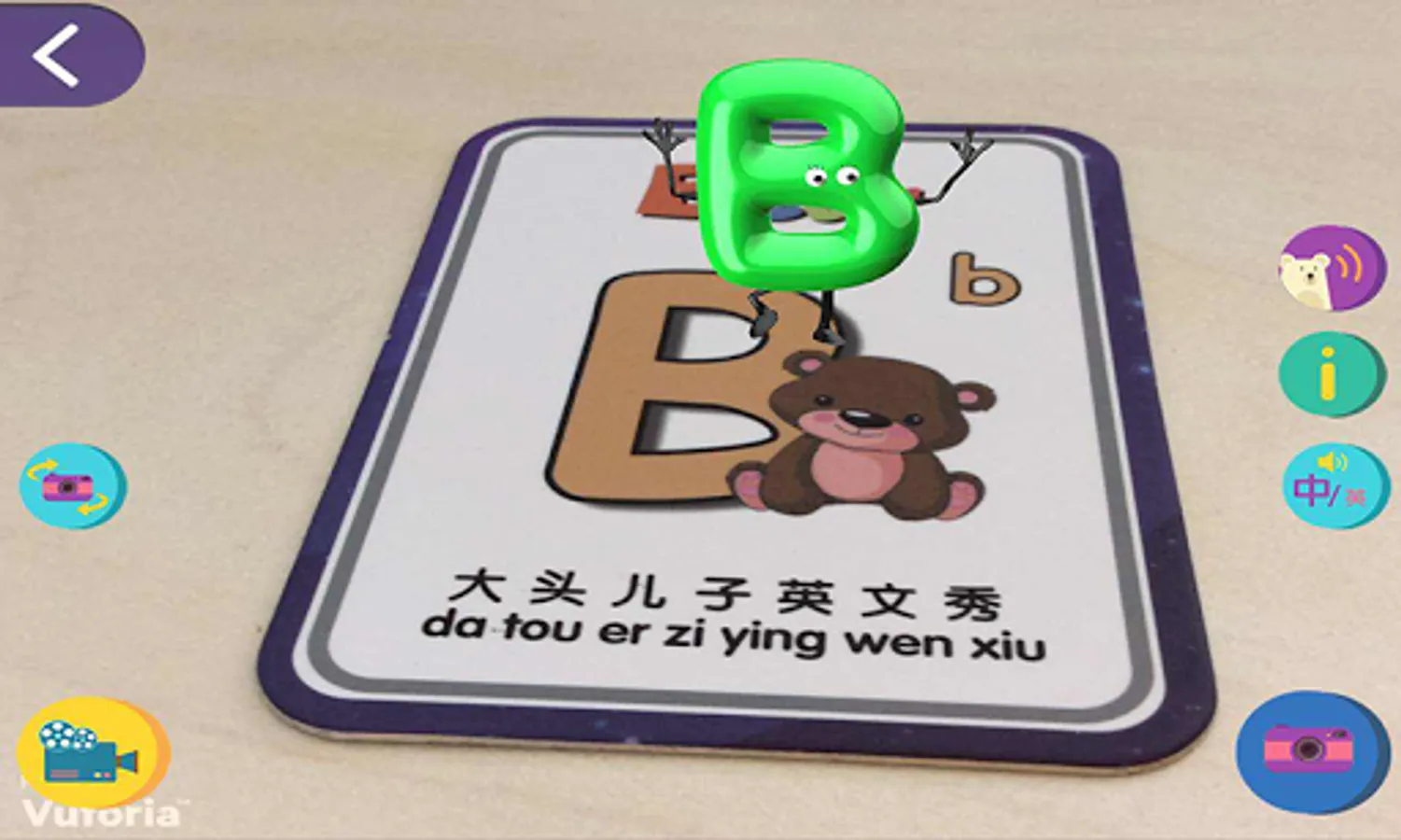 Click on a card mode on the main menu, after entering through the camera to identify the appropriate entities card on the device screen will appear corresponding 3D bulk of his son, animals, digital, English standing or suspended on the card, then you can manipulate the screen with them 360 ° rotation, zoom, drag to move the location of other interactive thereof. And you can take pictures and 3D bulk of his son, photo, and small video shoot. Users can upload their own video productions shot to the cloud saved in Video center can view your video and other small users little video.