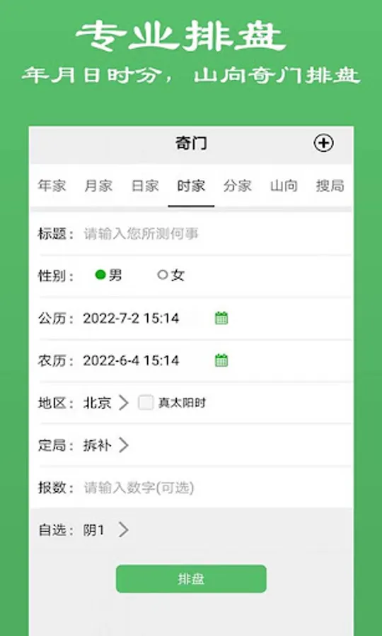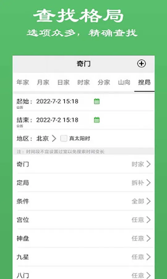 2. It has the following starting methods: Nianjia Qimen; Yuejia Qimen; Rijia Qimen; Shijiaqimen; Kejiaqimen; Custom Qimen (choose the layout by yourself); search for games (search for a period of time that matches Conditional odd door game). Each method is equipped with the number of reports to choose from