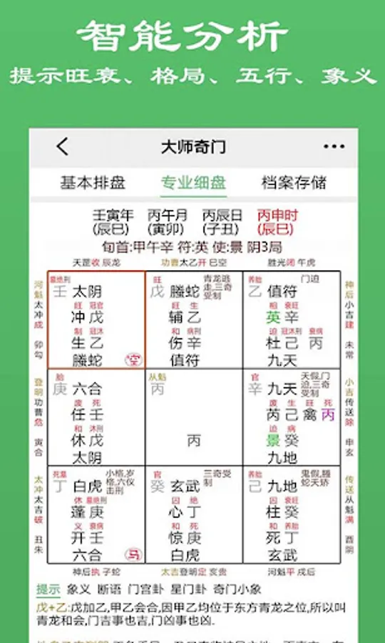4. Each palace of the Qimen Bureau is equipped with the meaning of the combination of heaven and stem, the meaning of the combination of gate and palace, the pattern of good and bad, 12 status prompts, Tianmen Dihu, Dunjia Chuanren, Mengong Gua, Xingmen Gua, etc.