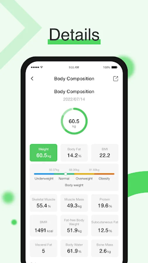Arboleaf app and Smart Scale make it easier for you to track your health, fitness and set goals. Step on the Smart Scale, you can have your overall body composition data including:
