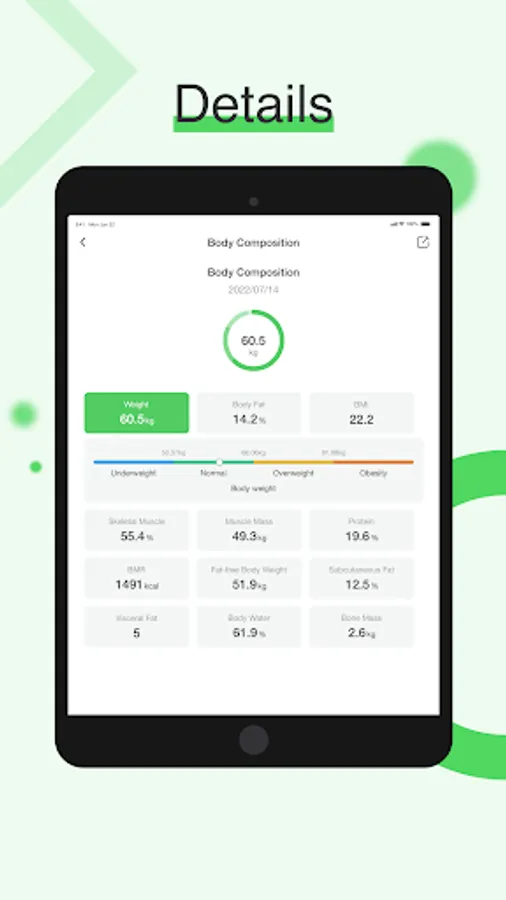 Your weight and your body composition data are your personal information. We treat your privacy with priority. Only you can access your data, and only you can decide how to share your data with others.