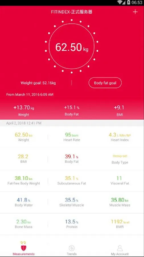 FITINDEX is the top app to be a healthier. The app can track your body compositions (BMI, body fat percentage , body water , bone mass , the rate of basal metabolism body age , muscle mass and so on),and cloud -based intelligent data analysis and tracking , providing the perfect healthy body composition analysis charts and reports。 At the same time the full support of the family used together , allowing you to understand the health status of the family anywhere .