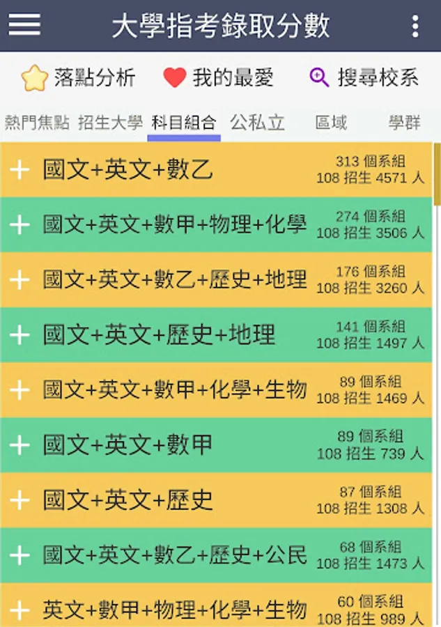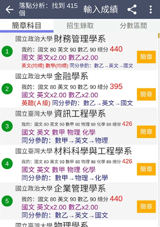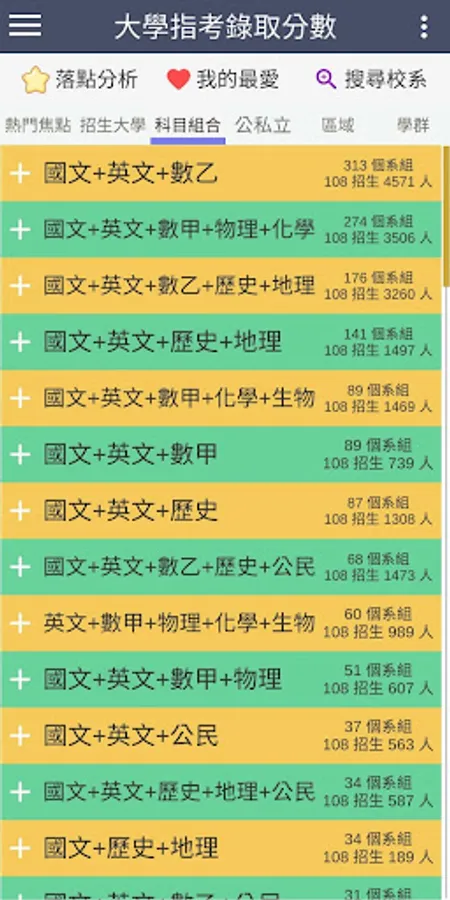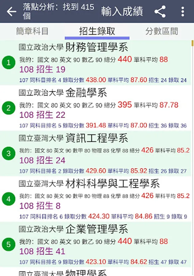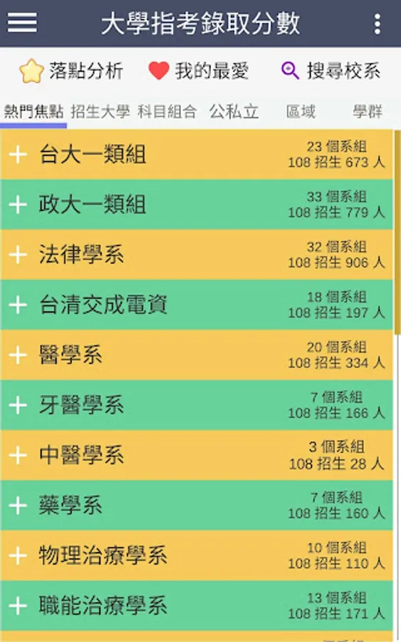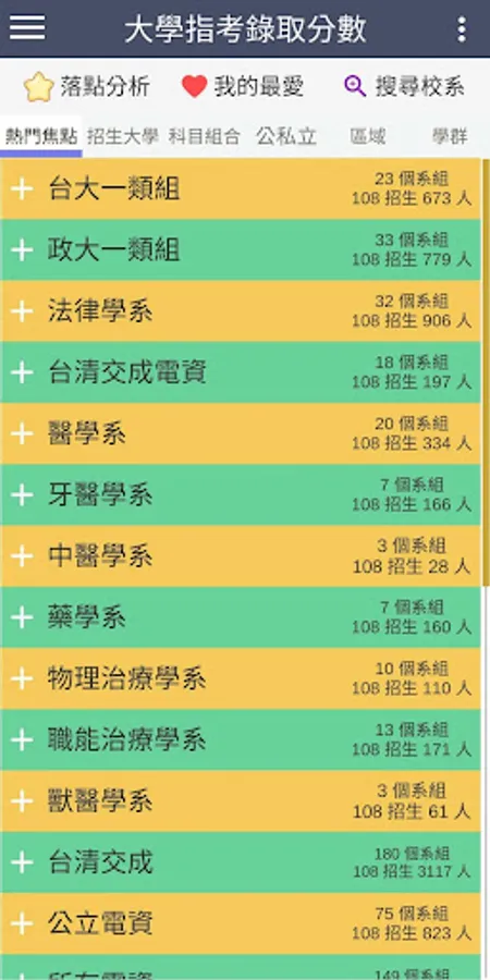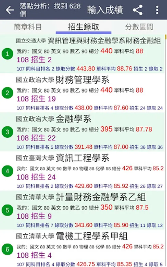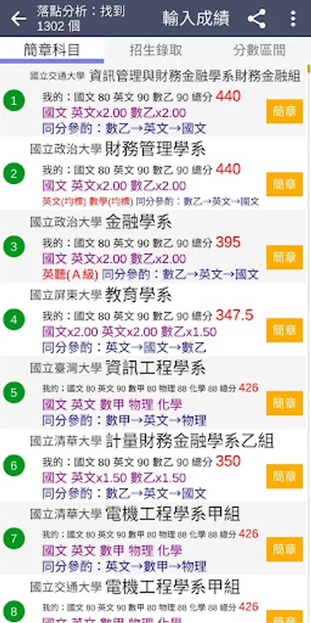 ・Display the link to the profile of each department, the previous admission scores, the number of students enrolled, the number of people admitted, the ranking of the same subject combination, the number of people in the score range, and the percentage