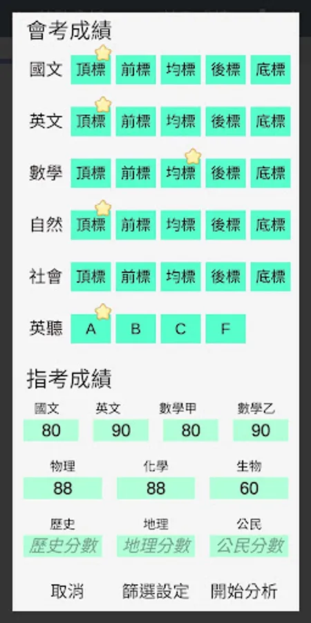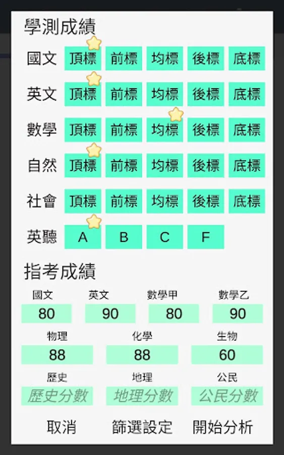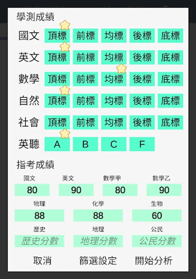 ・Convert the input results of the placement analysis to the individual subject scores of the previous year (according to the statistics table of the number of individual subjects published by the University Examination Center)