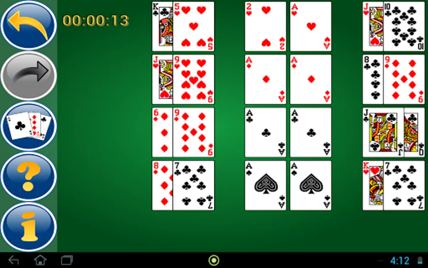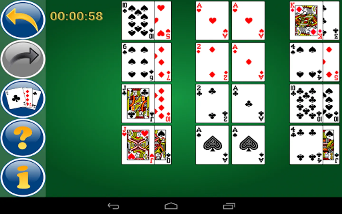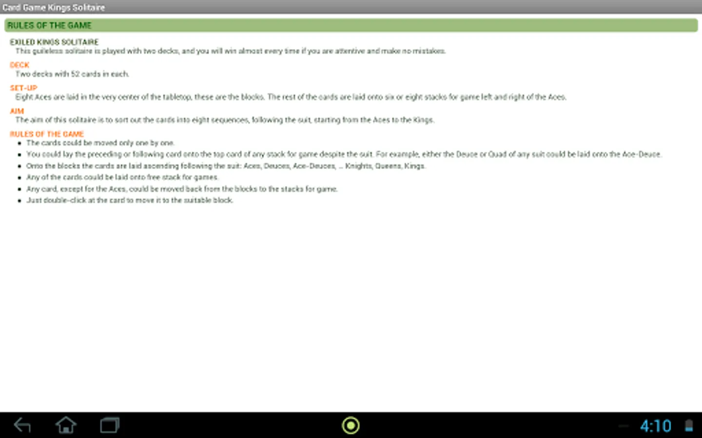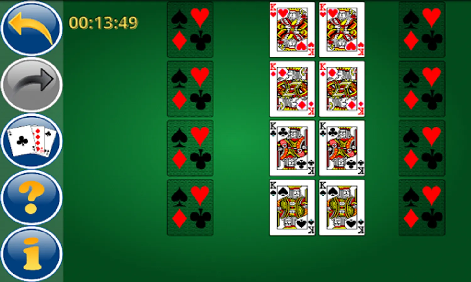 Exiled Kings is a very exciting solitaire. You will probably consider it difficult at first glance, though it is far from it! Your aim is to sort out ascending two 52-card decks onto 8 blocks following the suit from the Ace to the King from 6 or 8 stacks for game (the number of the latter depends upon the chosen level). The suit does not matter at the stacks for game aside – you are welcome to lay any following or preceding card, either ascending or descending. However, this extraordinary and breathtaking solitaire demands being attentive and accurate. All in all, you have a chance to play it successfully on the first try, if you catch the point matter of the game and, of course, follow the sound strategy.