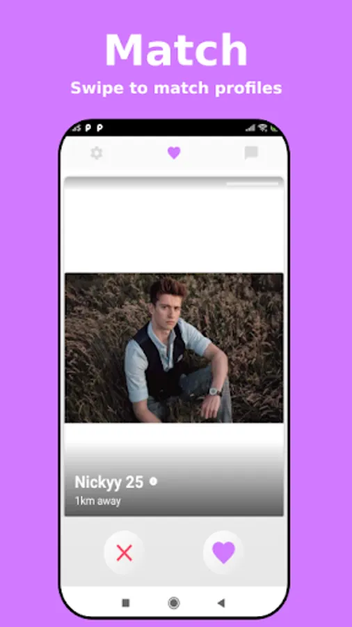Set up your account in within few seconds and you are ready to go. You swipe nearby profiles, match then chat or meet up.