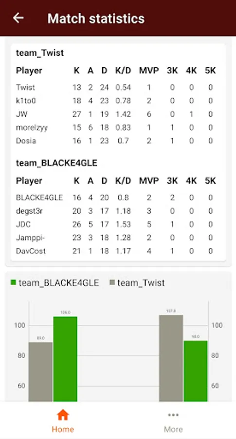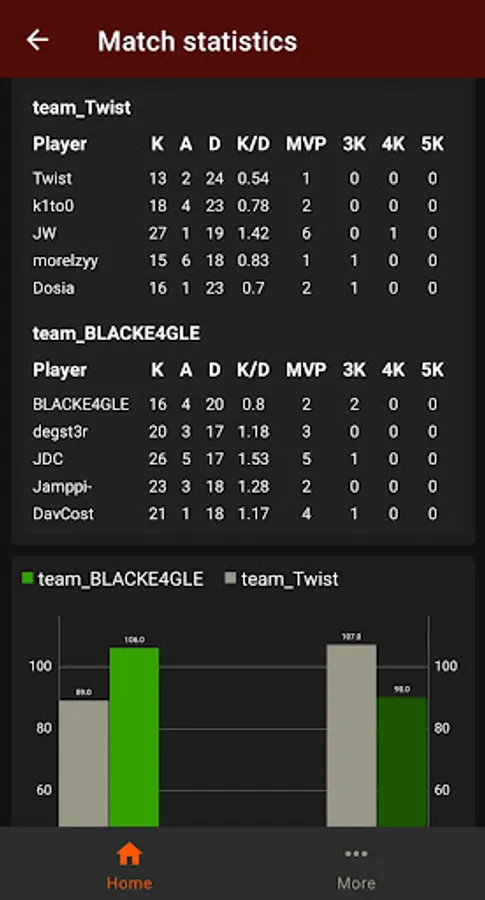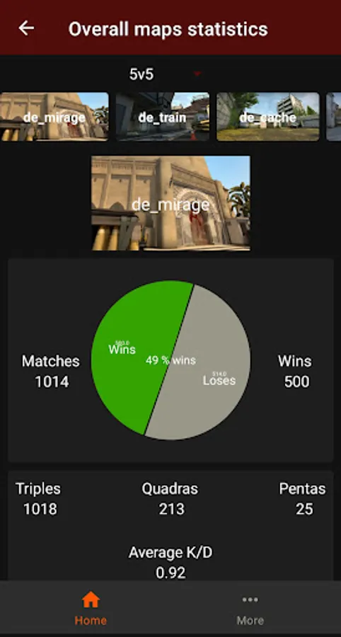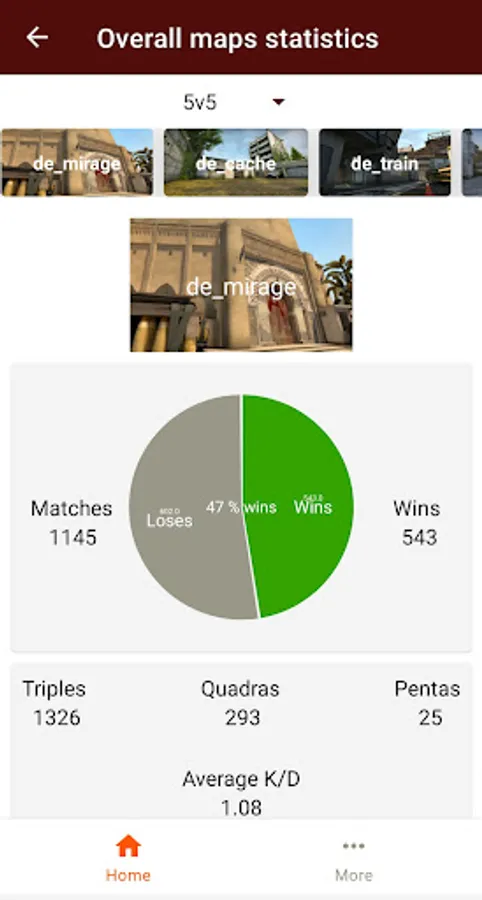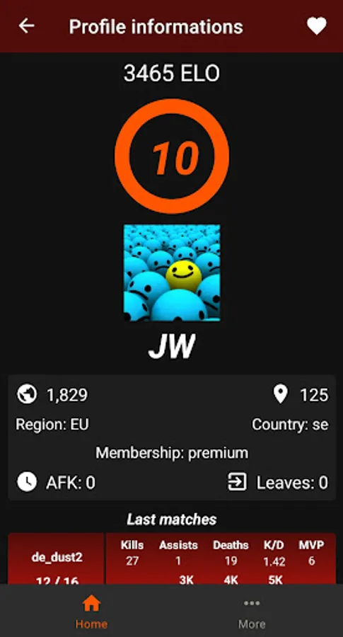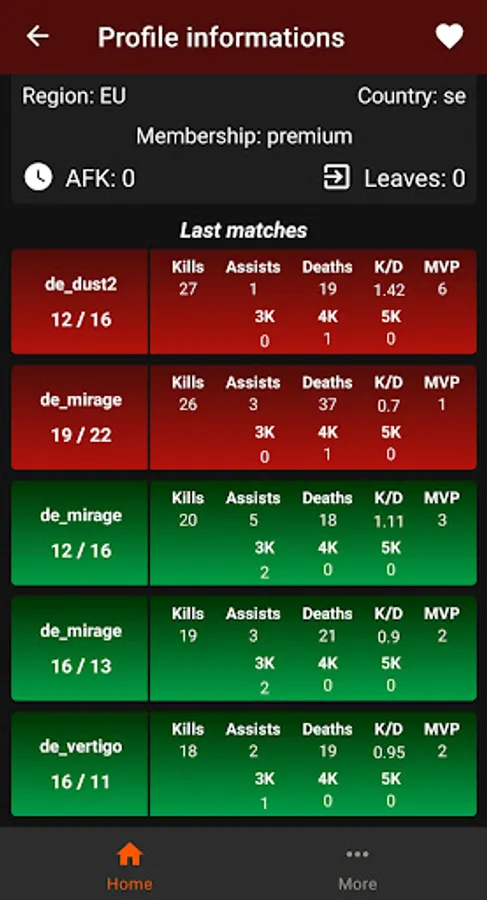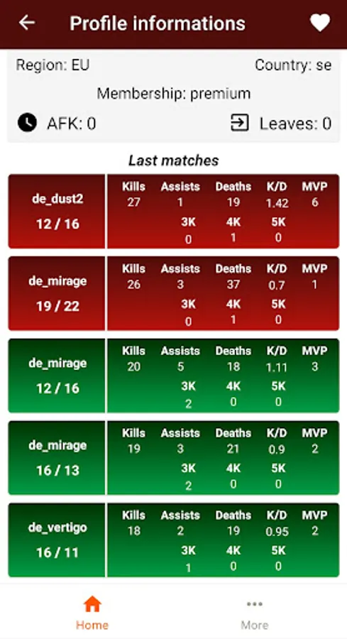 With FACEIT Stalker, you can browse your recent CS:GO matches with detailed statistics for every player that took part of that match. Keep track of your all-time stats on every map (5v5, 2v2, 1v1). Add profiles of your friends or beloved PRO's to favorites so you can stalk on them even more easily!