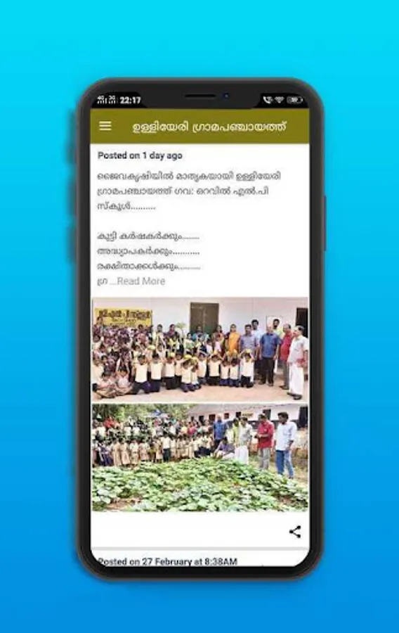 An exclusive app for Ulliyeri Grama Panchayat. The app offers exclusive updates from Ulliyeri Grama Panchayat, where a user can download and install the app for free to use the service. Sign-up and registration are not required for the user to use this app.
