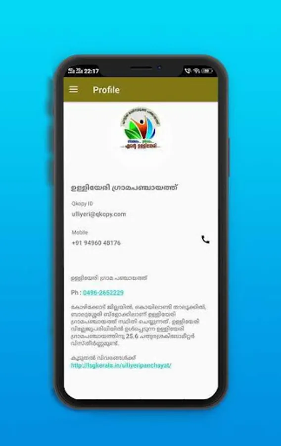 The App Service is offered by Qkopy Online Services Private Limited in association with the Ulliyeri Grama Panchayat Authorities. The Ulliyeri Grama Panchayat App Profile is linked to the Qkopy App services offered by Qkopy Online Services Private Limited.
