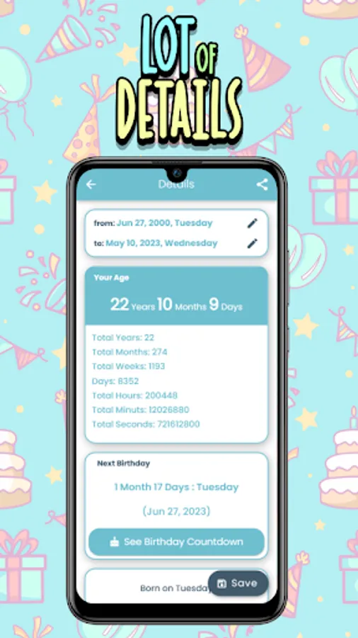 Age Calculator - Date of Birth also allows you to edit the saved data in your list of important dates, giving you the flexibility to correct errors or update information when needed. Furthermore, you can share each screen of the app with the most relevant data, such as the countdown to your next birthday or information about your zodiac sign, with your friends and loved ones through social media or other messaging platforms.