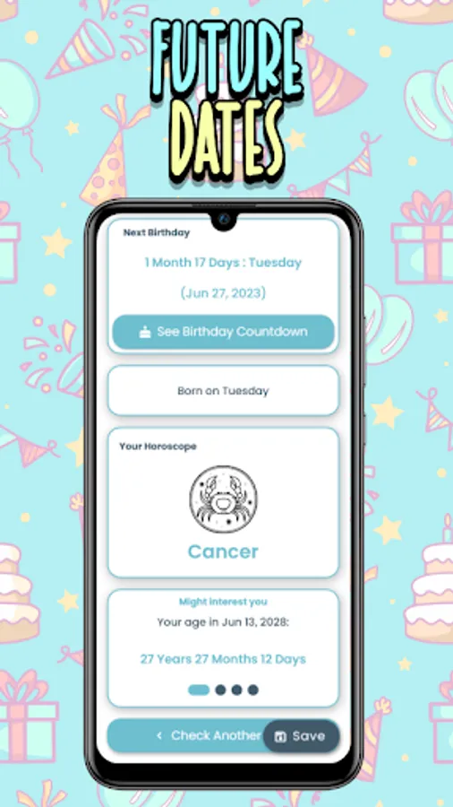 Another useful feature of Age Calculator - Date of Birth is the ability to display upcoming dates on which you will turn a certain age. The app generates a clear and organized list of the upcoming years in which you will celebrate your birthday, enabling you to plan and anticipate future milestones in your life.