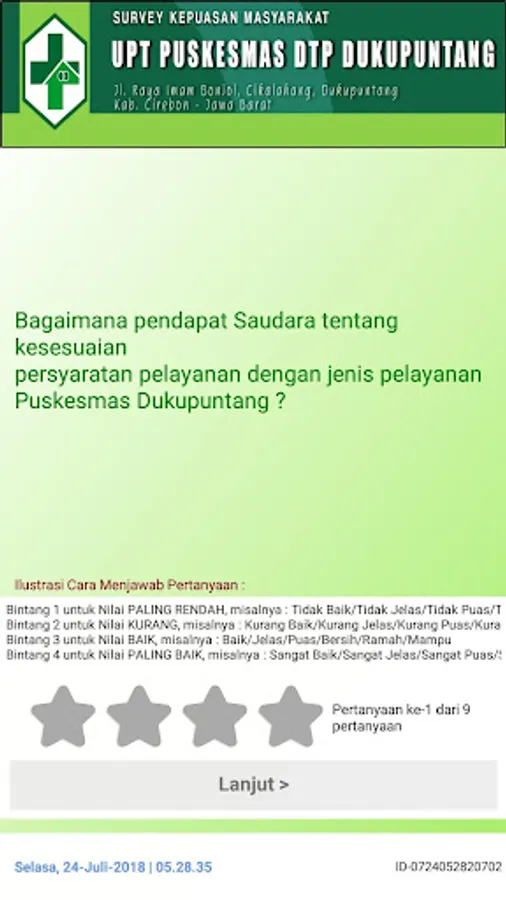 The list of questions presented in this application in questionnaire mode can be fully controlled by the administrator by referring to the Minister of Administrative Reform and Bureaucratic Reform Regulation No. 14 of 2017. Likewise with the option of dissatisfaction of customers / service users.