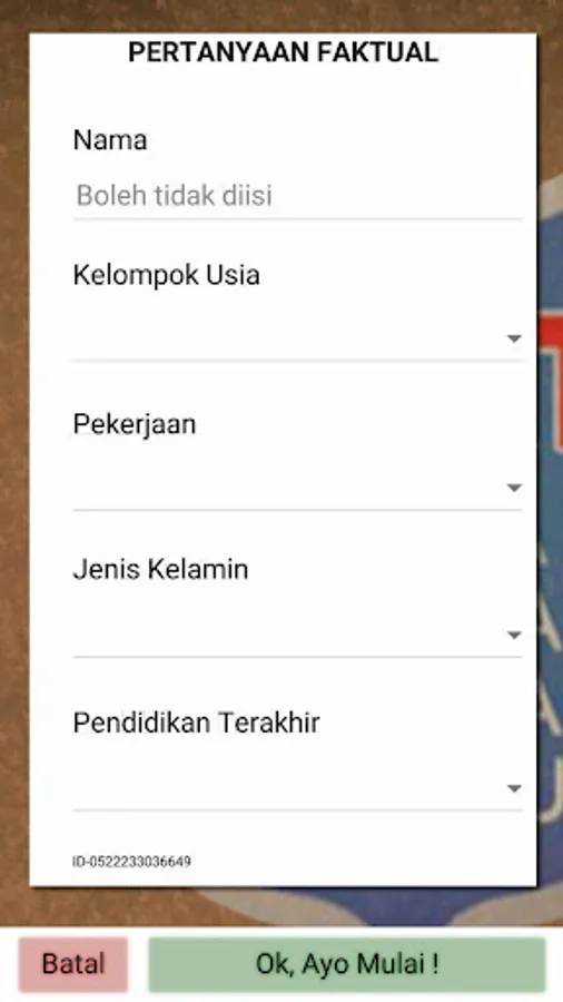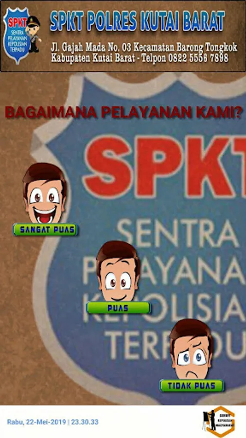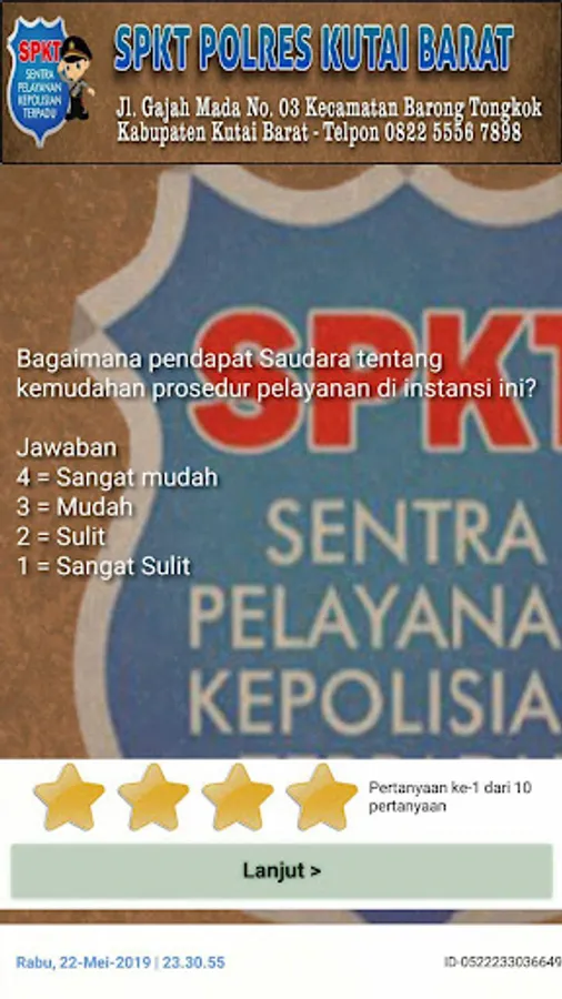 The Community Satisfaction Index Survey application for SPKT Services at the West Kutai District Police Satpas is available in two survey modes namely Regular Mode and Questionnaire Mode. For Questionnaire Mode in this application, it is made by referring to the questionnaire format of the calculation formula in accordance with Minister of Administrative Reform and Bureaucratic Reform Regulation number 14 of 2017.