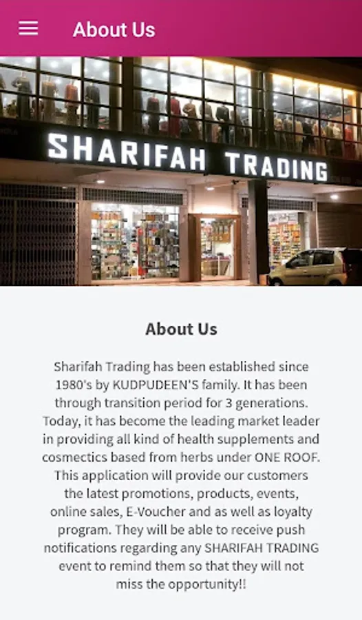 Sharifah Trading Sdn Bhd has been established since 1980's by KUDPUDEEN"S family. It has been through transition period for 3 generations. Today, it has become the leading market leader in providing all kind of health supplements and cosmetics based from herbs under ONE ROOF. This application will provide our customers the latest promotions, products, events, online sales, E-Vouchers and as well as loyalty program. They will be able to receive push notifications regarding any SHARIFAH TRADING SDN BHD event to remind them so that they will not miss the opportunity!!