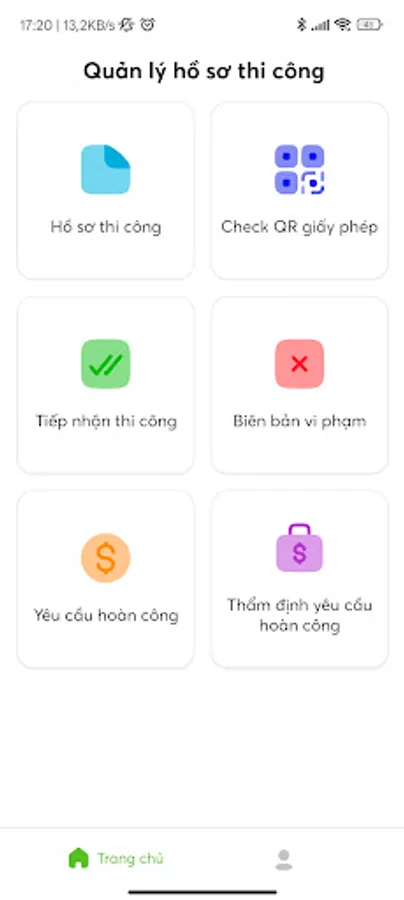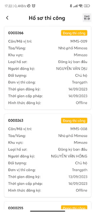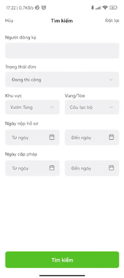 The application supports staff in charge of financial management at Ecopark to manage and control the construction registration process of residents, including steps: