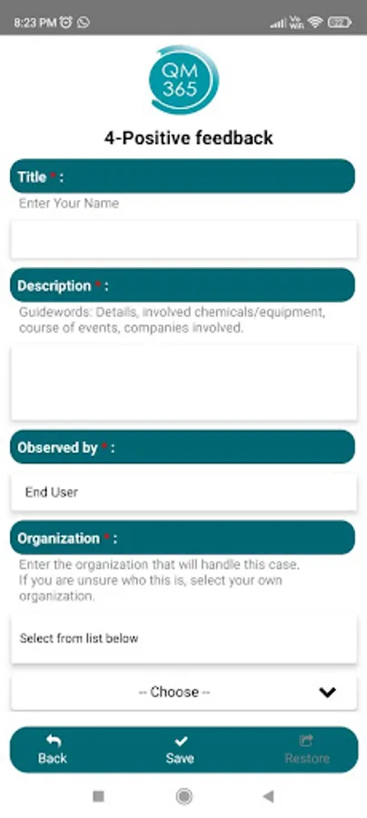 Through the QM365 App, users/employees can record incidents, deviations, improvement proposals, measurements, safety inspections, job safety analysis, car pickups, services, inspections, or any other desired registration from the mobile phone. Once finalized, a notification may be sent to a responsible/manager.