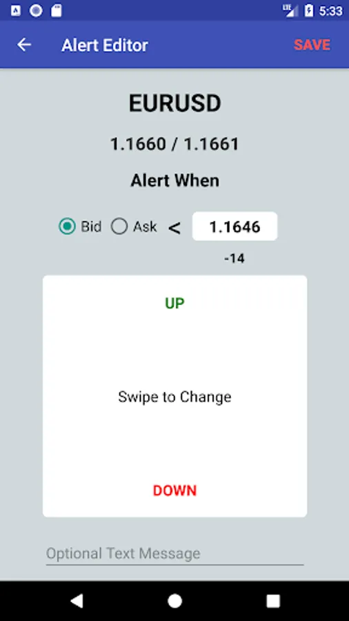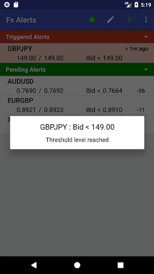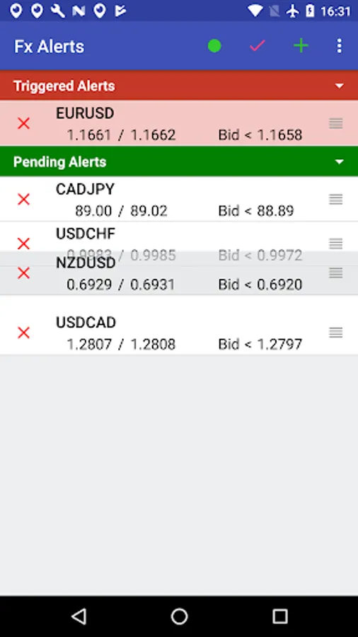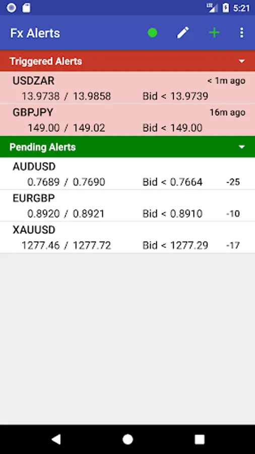 Forex price alert triggers can be set on the bid or ask price. Uses Google's messaging service. The App doesn't need to be running in order to receive an alert.