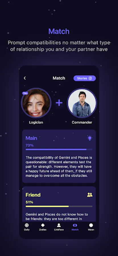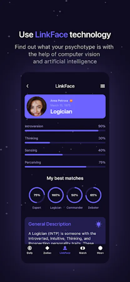 In the modern world, we meet lots of people every day and we play different roles with each of them. Also we have different types of relationships. Communication often requires a lot of time and effort to find a way to communicate with a particular person. So it is hard to quickly realize if your compatibility with a person is good. Use the Match section to find out if you and your partner are suitable for each other. It’s scientific! With the help of artificial intelligence and computer vision we will reveal your and your partner’s personality types first. Then we will provide you with detailed compatibility information. Learn about how you two will interact no matter what kind of relationship you have: as friends, colleagues, romantic partners or spouses.