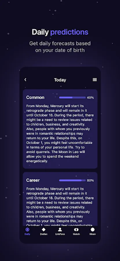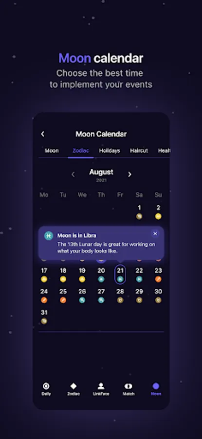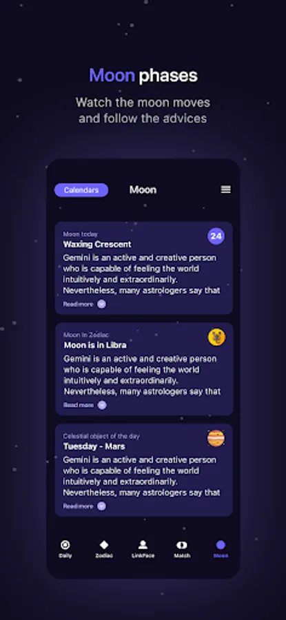 In the Moon section you will get the information about the Moon phases, celestial object of the day and how they can affect your life.