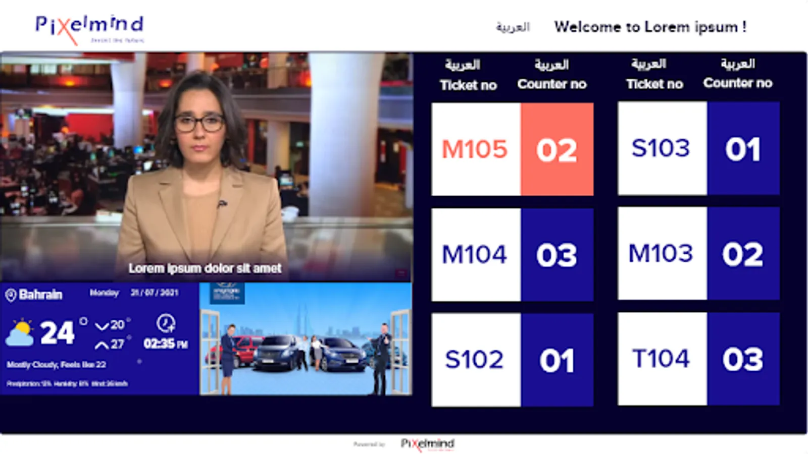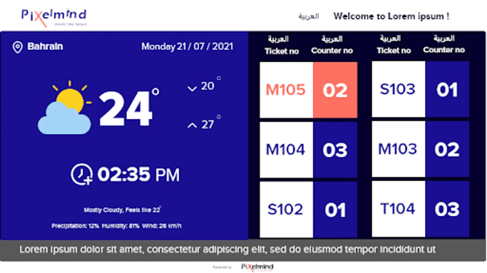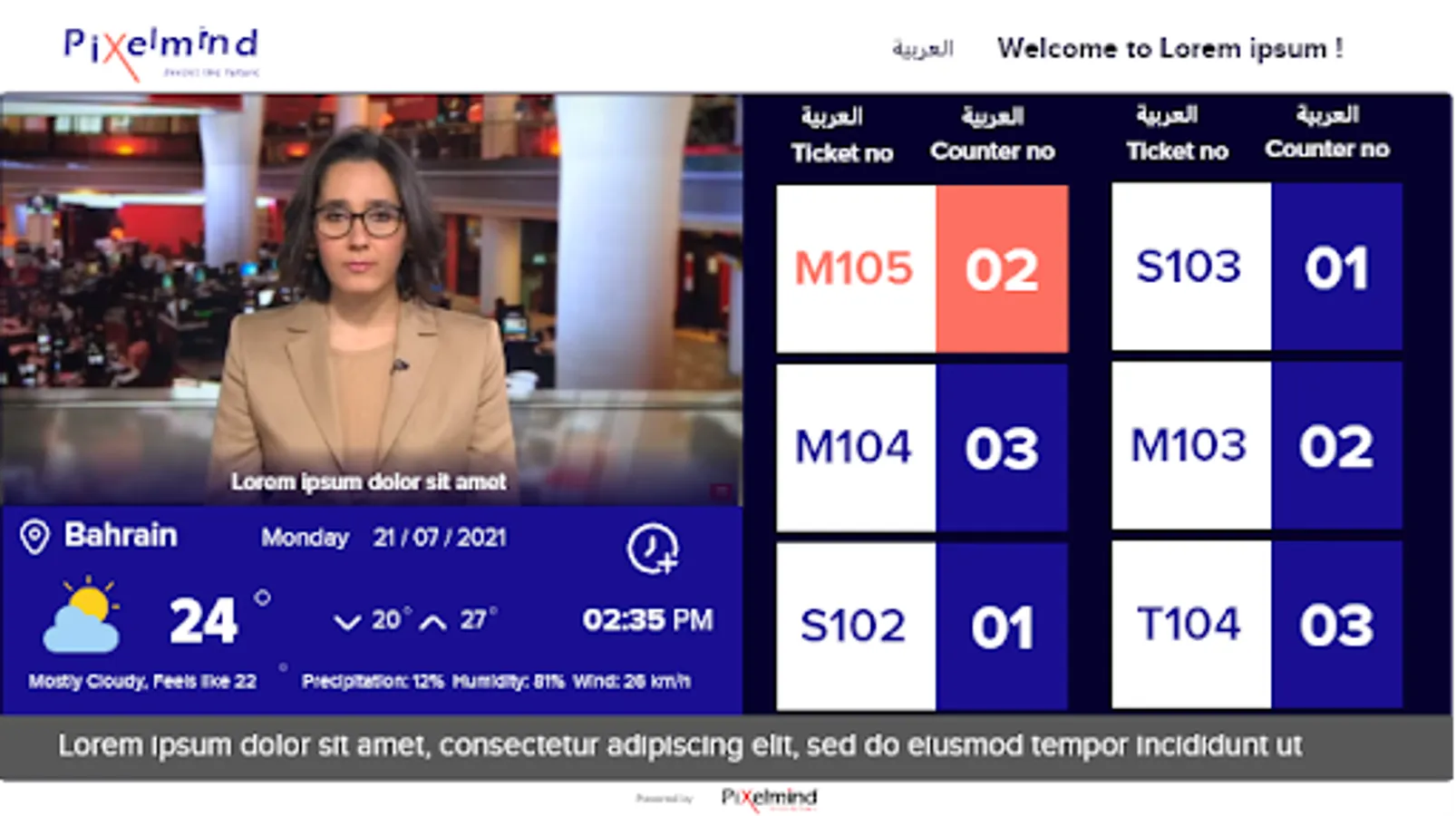 QFasto Screen allow the organization to present what been configured on the QFasto web; they can configure each screen separately to customize what to show like: Token numbers, Services, Live TV & Video, Weather, Advertising banner, special marque messages.