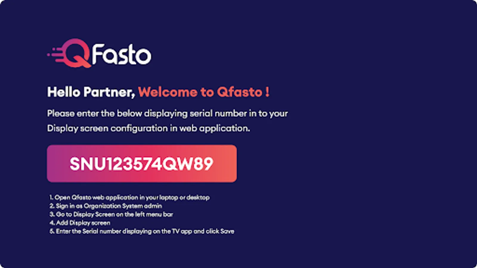 We have made the screen setup very easy and touch-free by entering the unique code generated by the installed App to the QFasto web. There is no need to buy a special TV model to operate our App.
