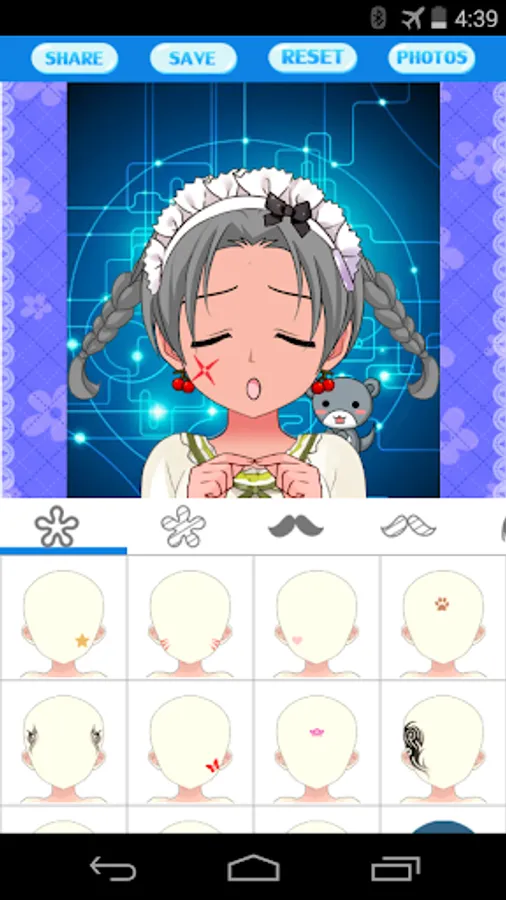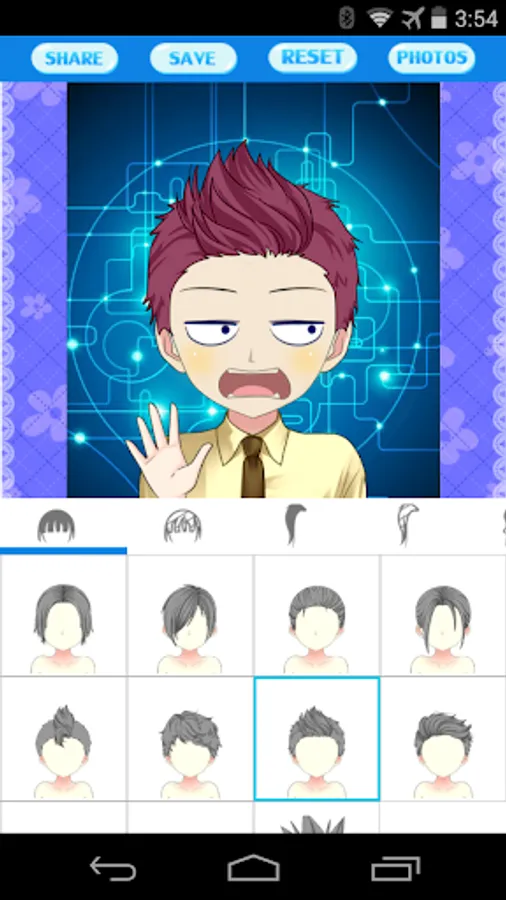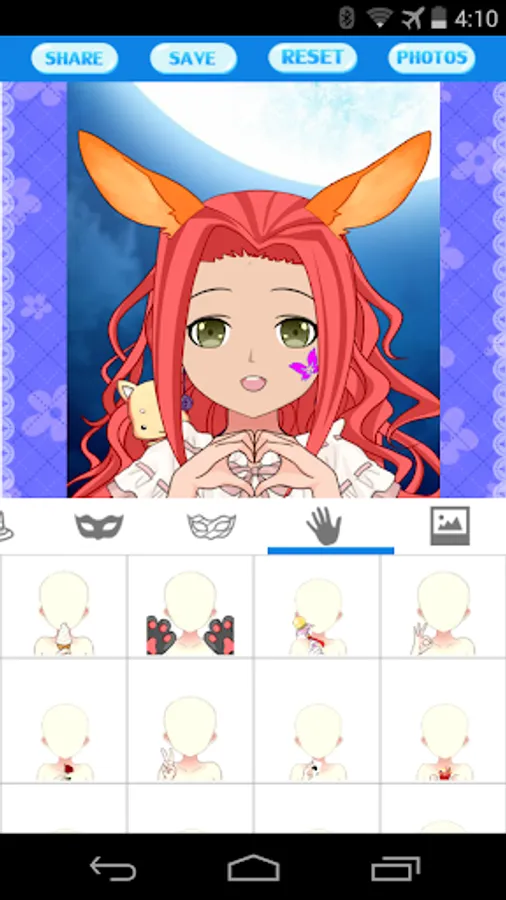 This application lets you easily create your anime cartoon avatar photos, head portraits and profile pictures. You can select among different types of faces, eyes, eyesbrow, mouths, hair styles, accessories and clothing. All these elements can be colored as you desired. Moreover, you can create various postures with funny gesture.