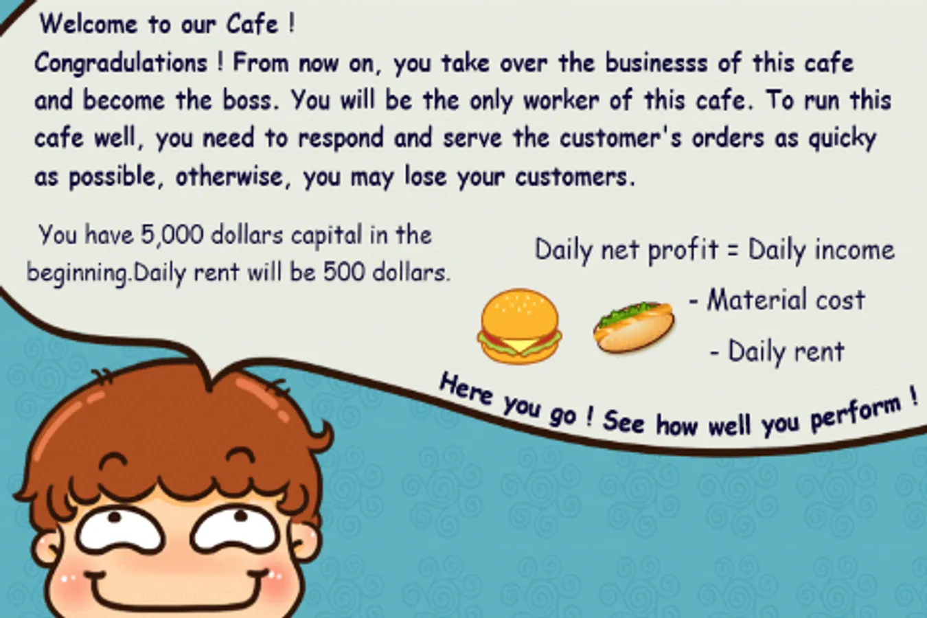 You'll be given $5,000 dollars in the beginning as capital, besides the material cost, you need to pay the daily rent as well. See how well you achieve. Don't let your cafe be in red.