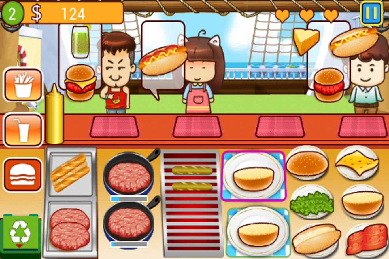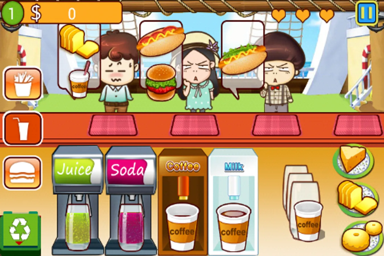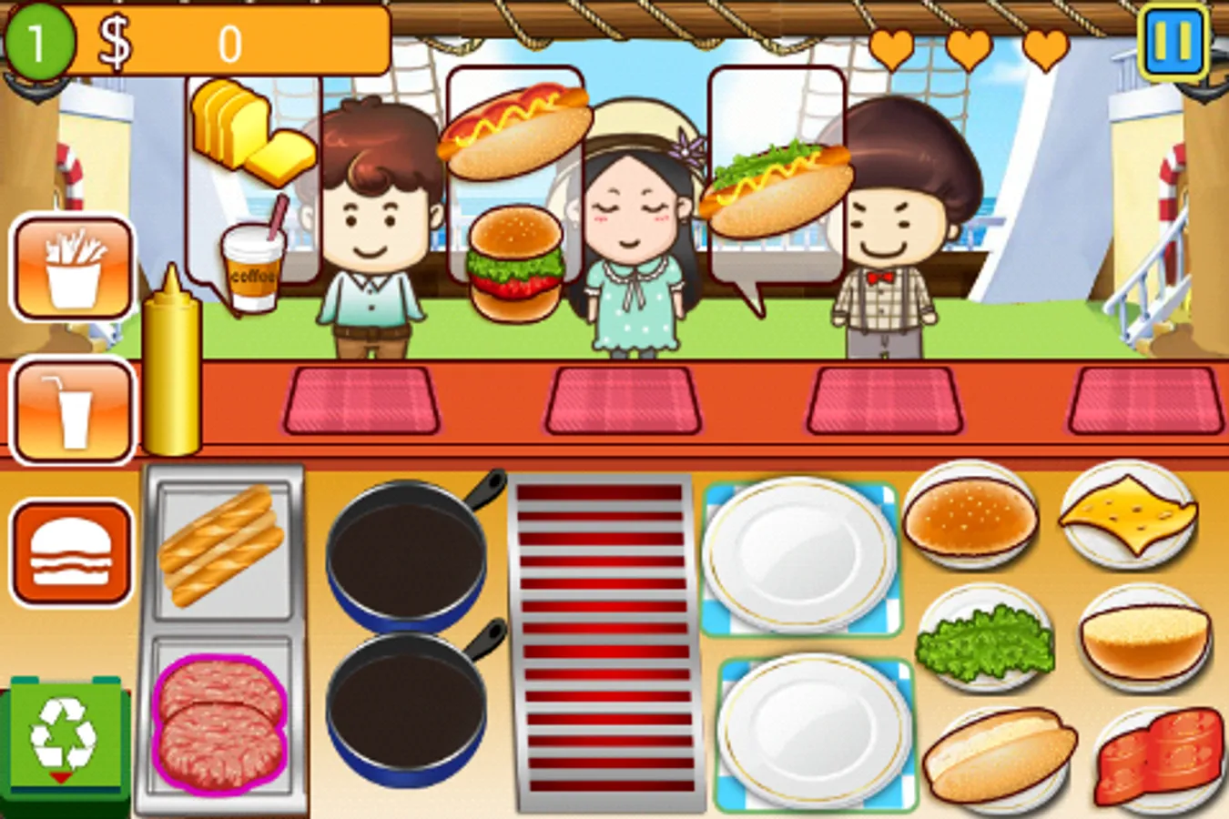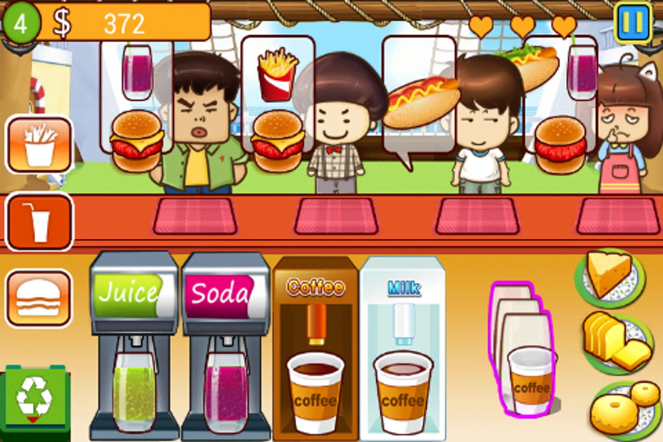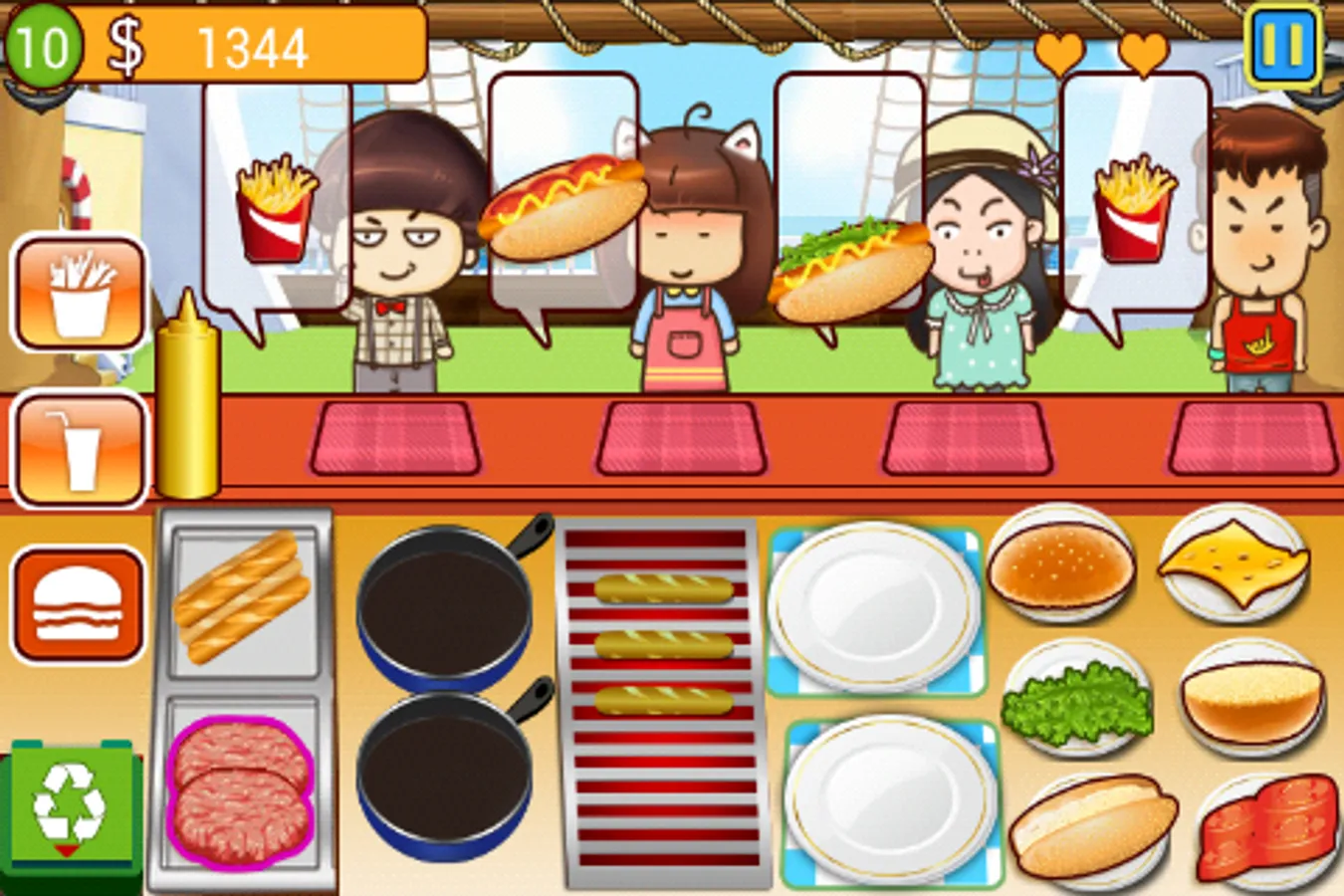 actual environment of a restaurant. Customers come in when there are vacant seats and place order for different kinds of dishes. You must react quickly to meet different orders from your from your customers. As you are the master chef in this cafe, you need to prepare all the food from top to buttom including hamburger, hot dog, beverages, french fries .... in time to satisfy your customers,