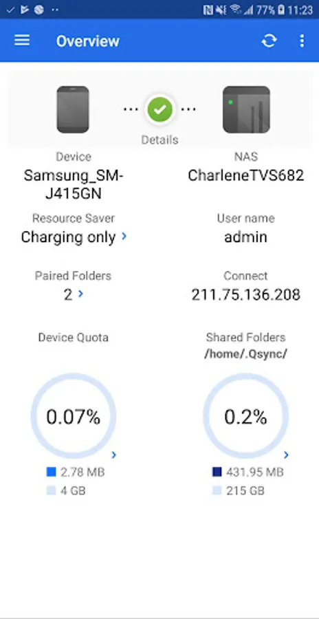 - View the connection details of your synchronized mobile device and NAS on the Overview screen.