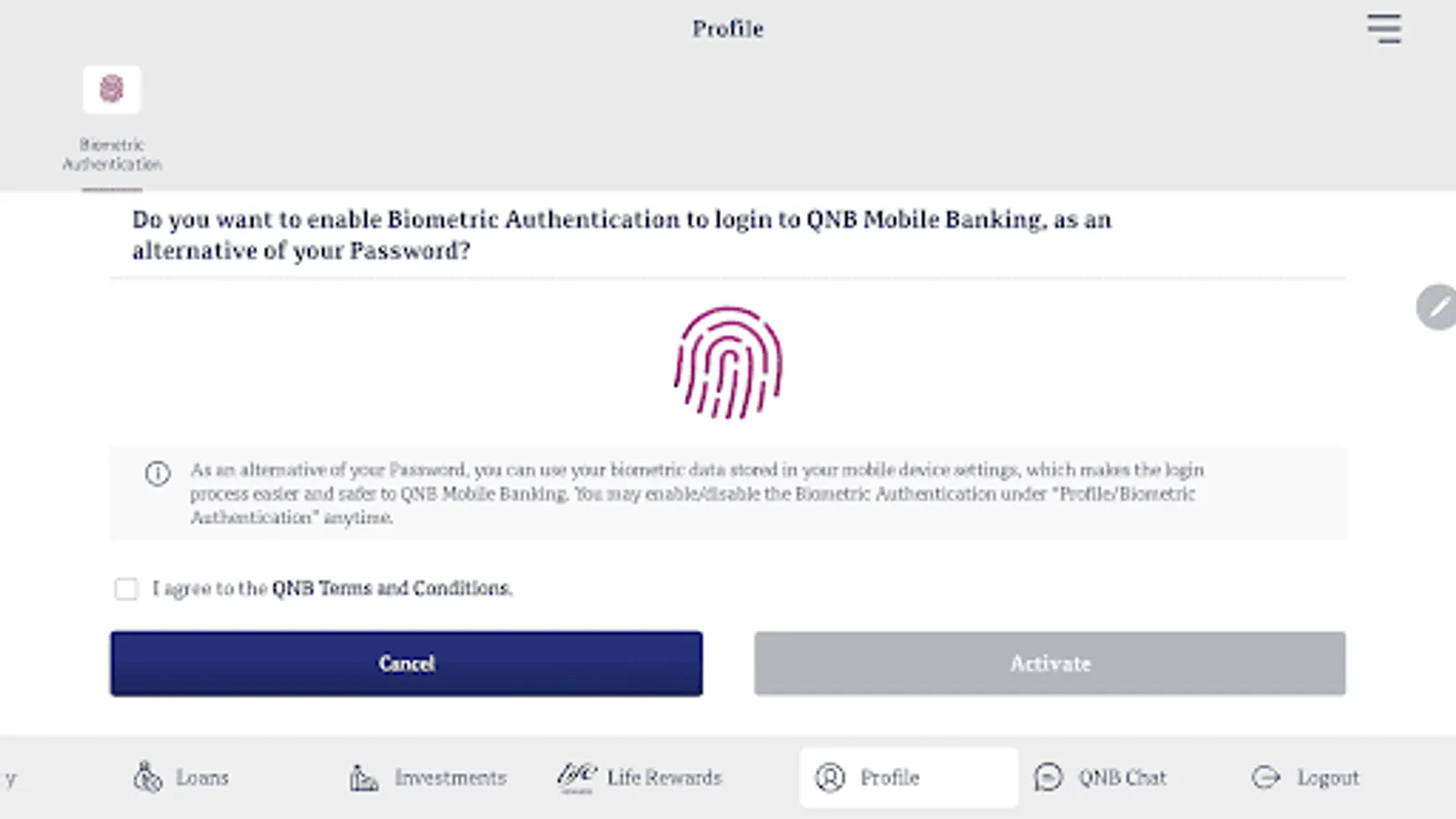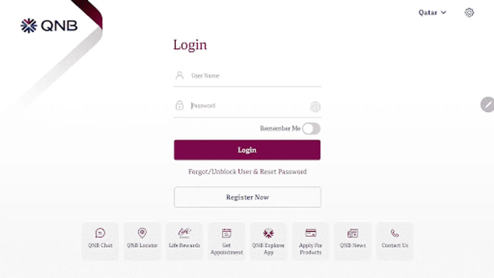 You can login with your QNB Mobile and Internet Banking user name and password, or if you forgot your credentials, you can securely reset through the App. If you have not registered yet, you can simply register selecting Register Now. If you are not yet a QNB customer, you still can enjoy many of our services.