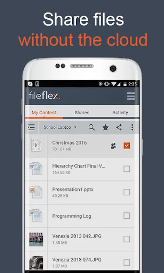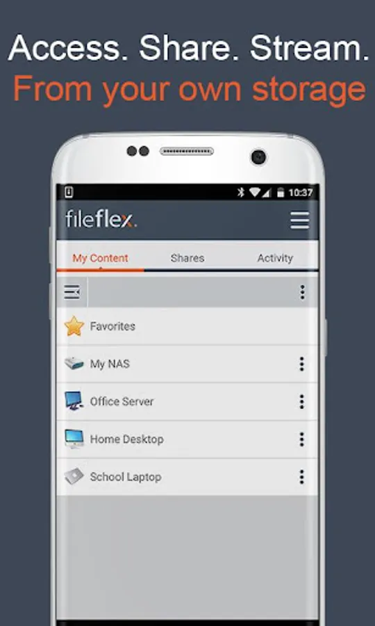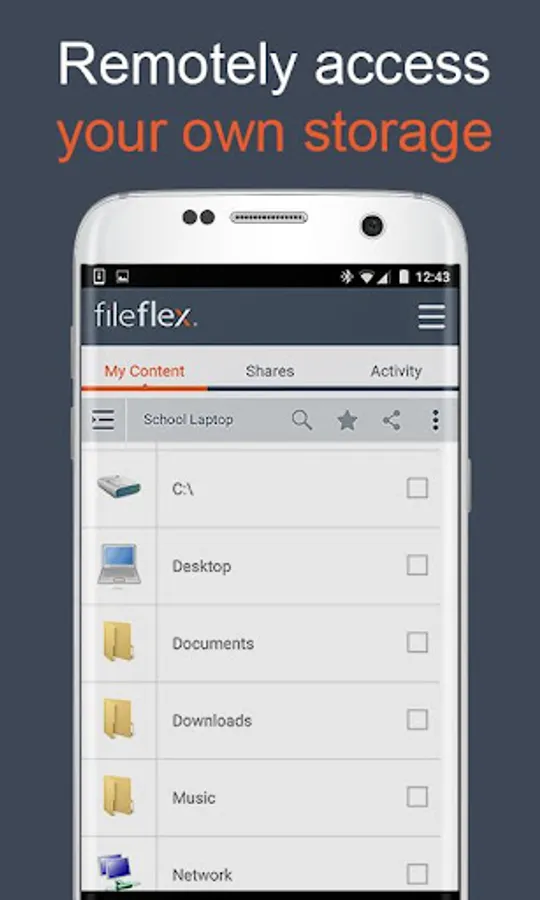 FileFlex provides remote access to your files from their source locations. Access can be from your Android smartphone, a Windows, Mac, or Linux computer; Android, iOS, or Windows tablet, or any internet-connected kiosk. The access to all storage is from a simple dashboard.