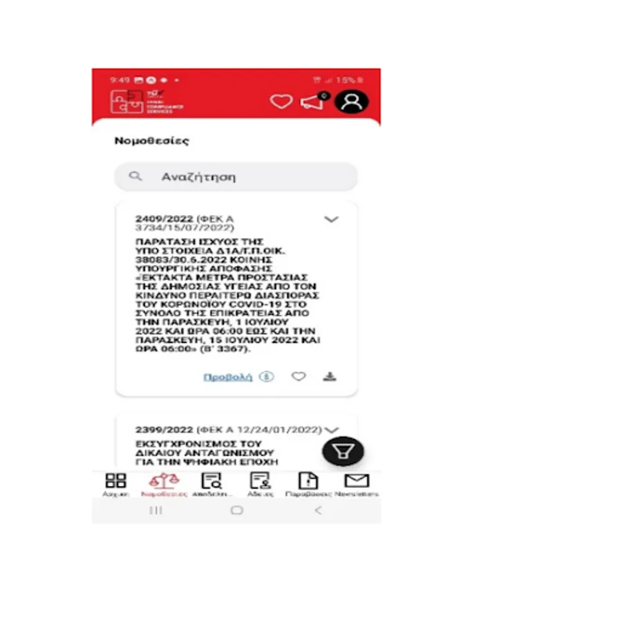• Continuous updating/updating of the legal compliance register and written notification of the Organization which will take place on a regular basis (after agreement), and in a timely manner, in cases where (if any) the law provides for a deadline for the Organization's immediate compliance with new obligations/requirements (info & alert)