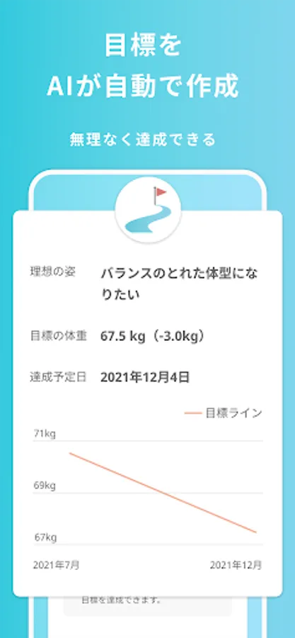 ・ After entering your current height and weight, answer questions such as your lifestyle, target weight, and what you want to be, and the period until you reach your target and the daily calorie adjustment will be calculated automatically. You can create your own goals without difficulty.