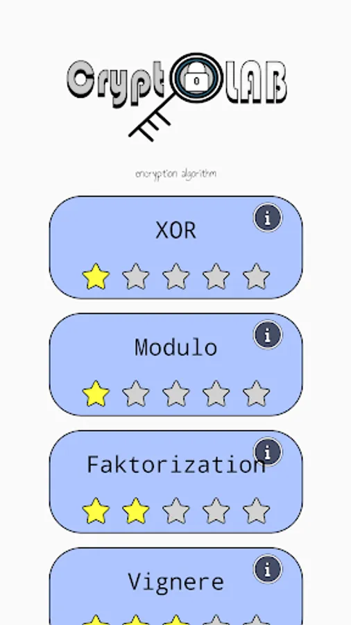 Test yourself and discover a lot of great new algorithms. Write down your own version of the famous algorithms on Java or Co. CryptoLab will help you to find errors or doubts and to better understand the individual algorithms.