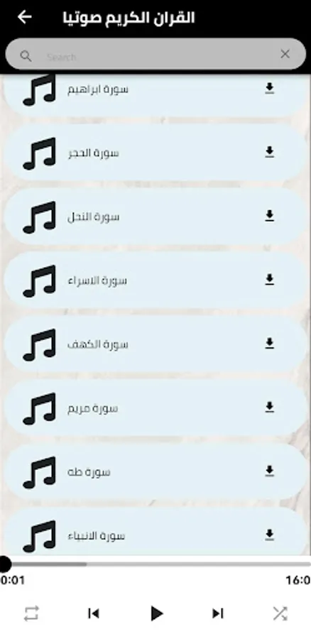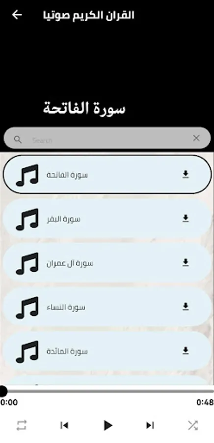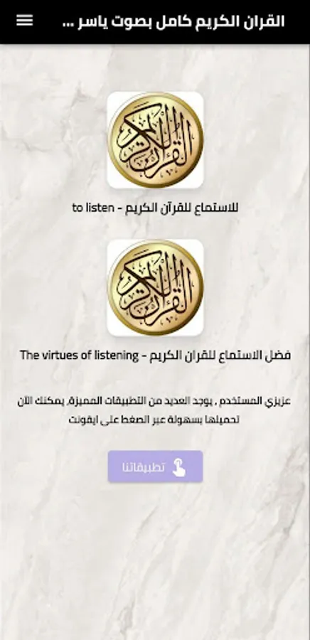 Try now the application, which contains the entire Holy Qur’an with the voice of Yasser Al-Dosari directly without the Internet and with the possibility of downloading.