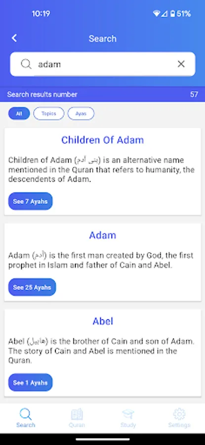 Easily find topics and ayas with the most advanced Quran search in English and Arabic!