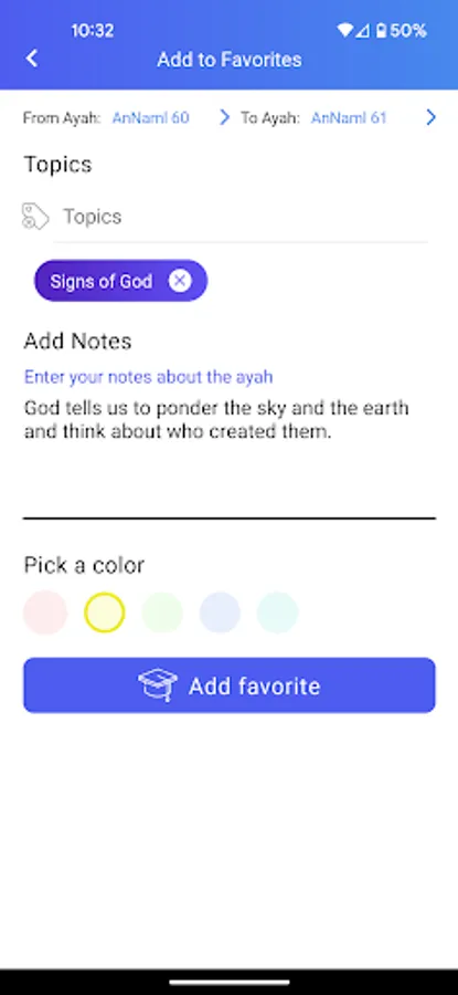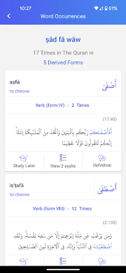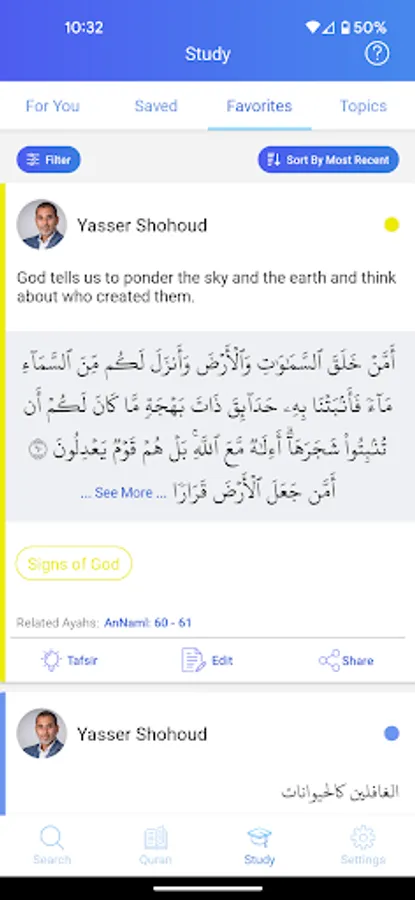 Then dig deeper to understand the meaning: Tap any word to see all ayas that use it or find its meaning in dictionaries. Tap any aya number to get different perspectives from 25+ tafsirs and many videos. When you find ayas that you want to remember, save them to your favorites and organize them using Topic tags.