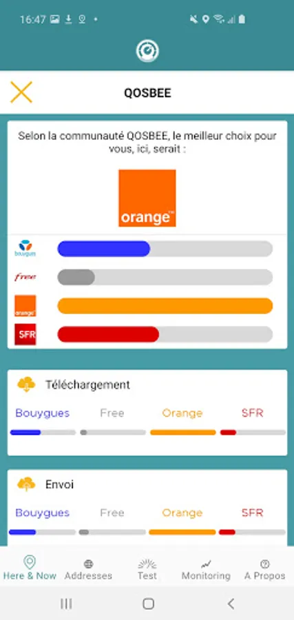 Qosbee offers a free personalized comparison of the performance of mobile operators in France and abroad. Easy to use and fun, Qosbee instantly offers: