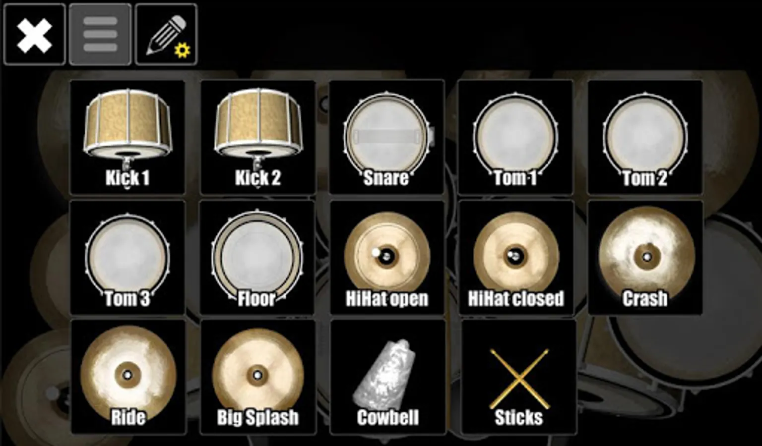Customizable percussions in drum kit: 2x kick base, 3x tom-tom, floor, hi-hat (open/close + pedal), cowbell, cymbals (crash, splash, ride), snare and rand stick sound.