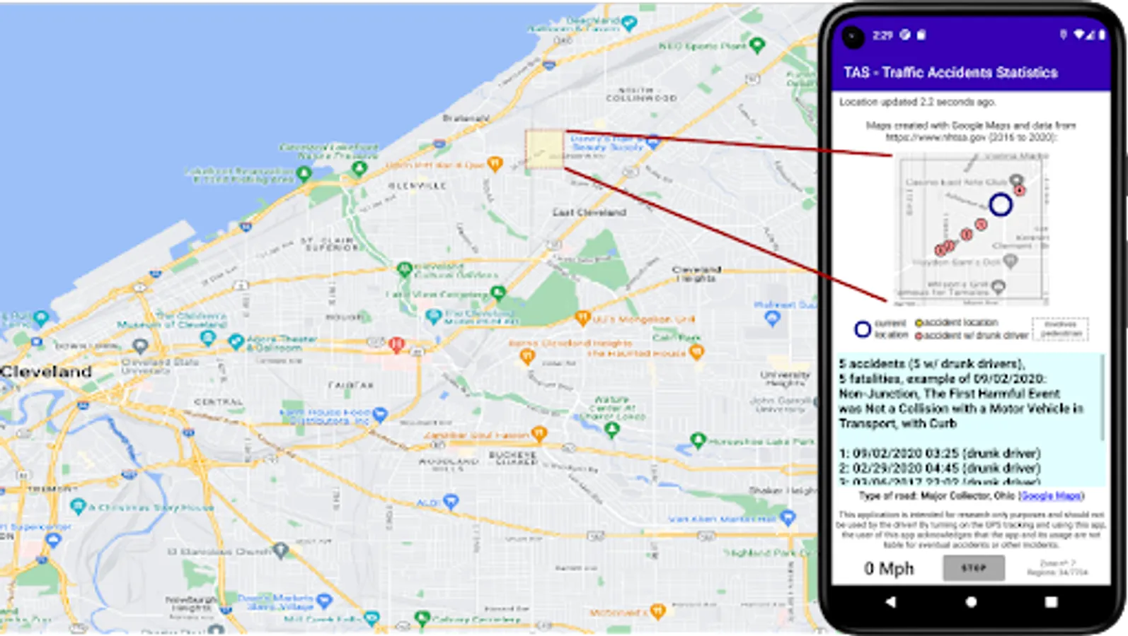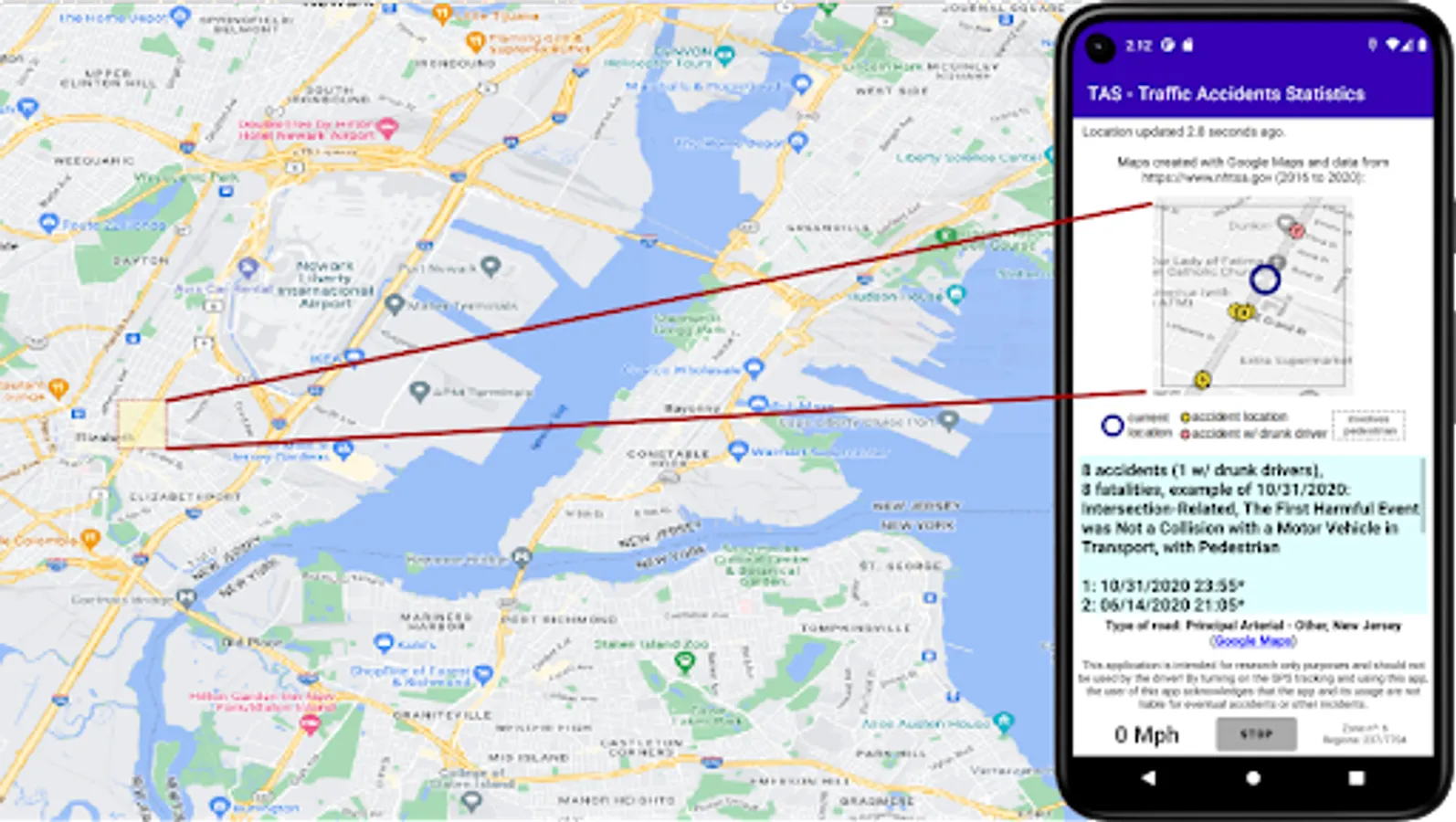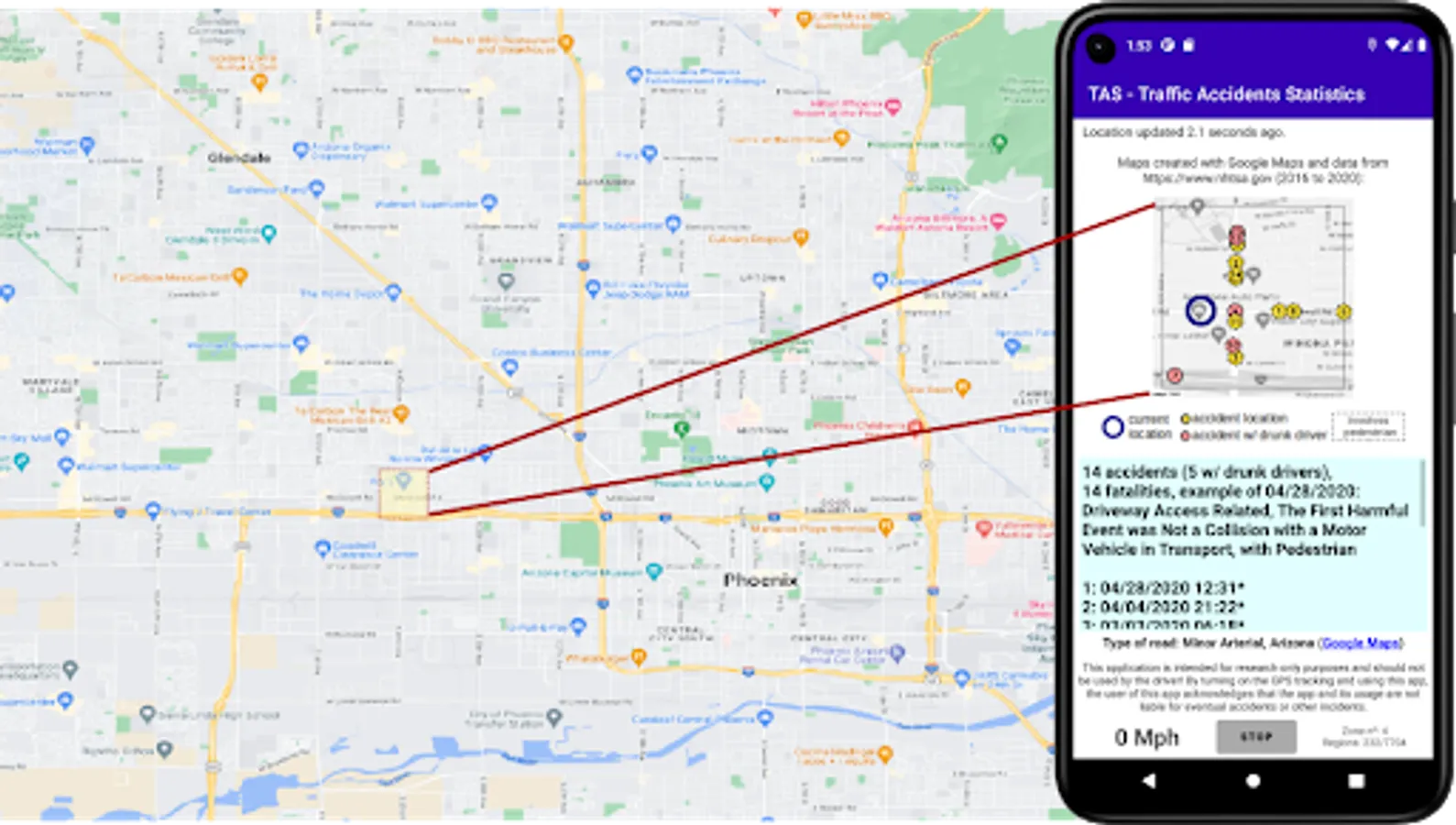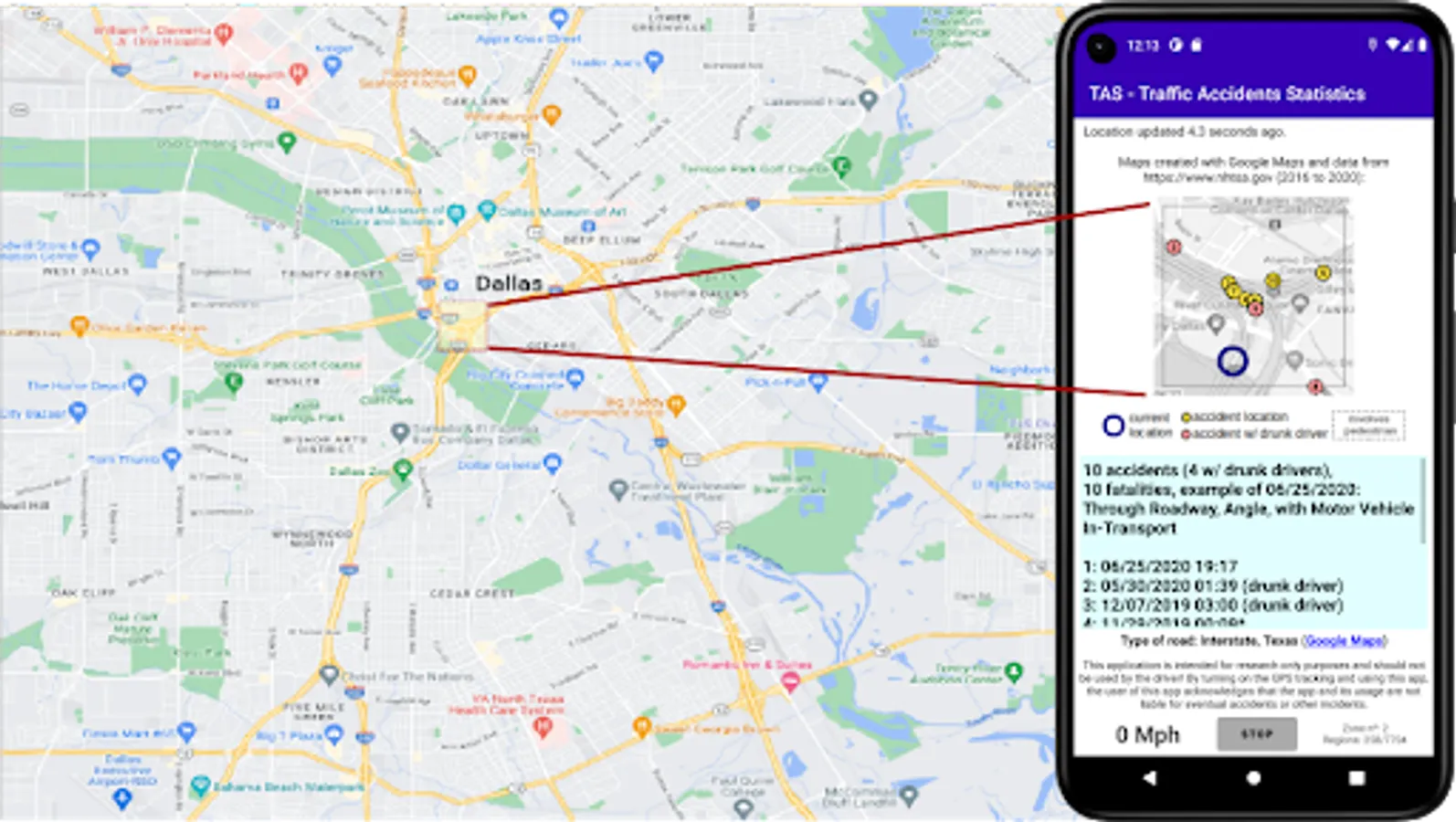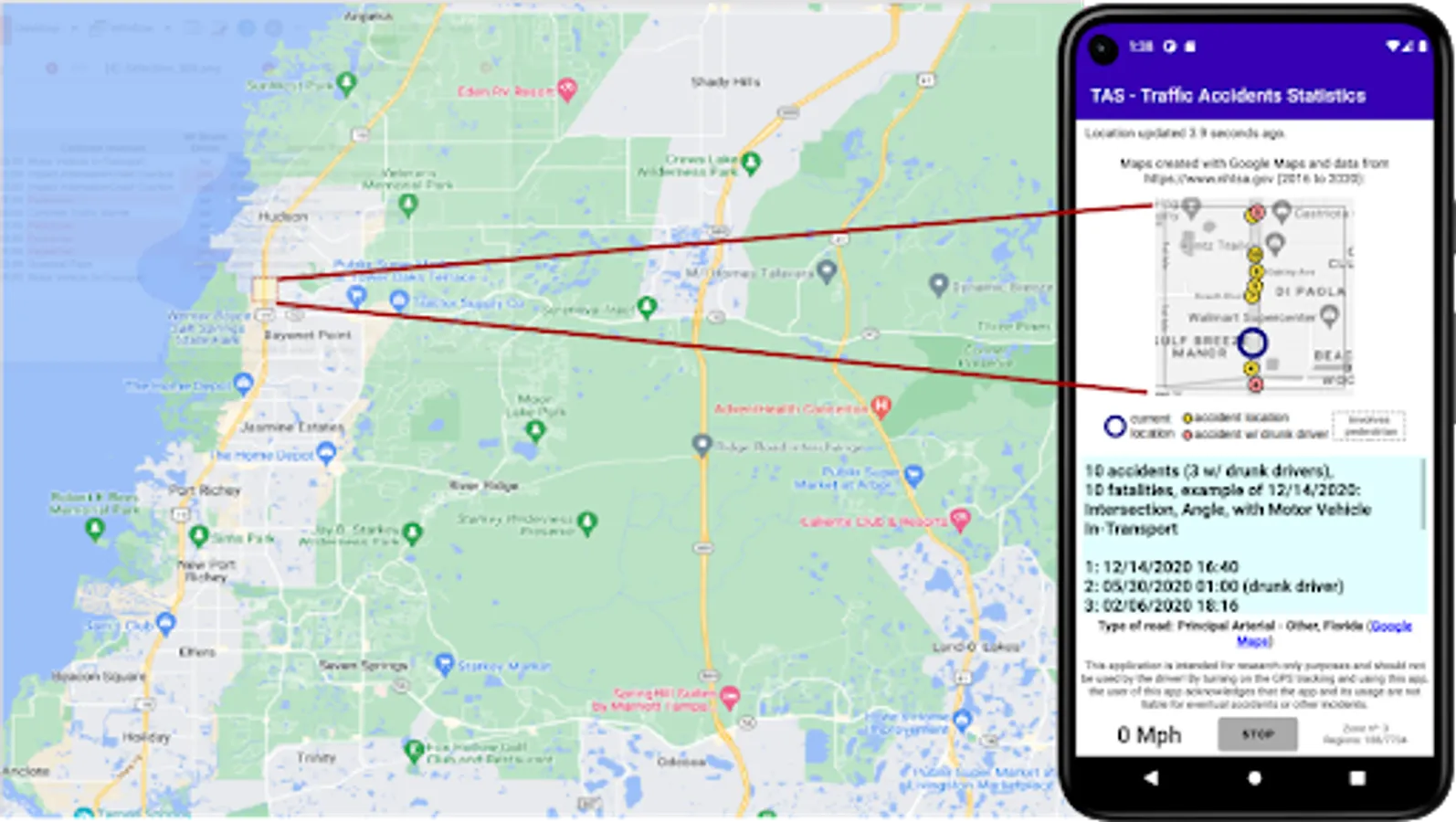 TAS shows map and traffic accidents data when entering a region (GPS located) in which there were at least 3 accidents with fatalities during the period between 2016 and 2020 (data from https://www.nhtsa.gov).