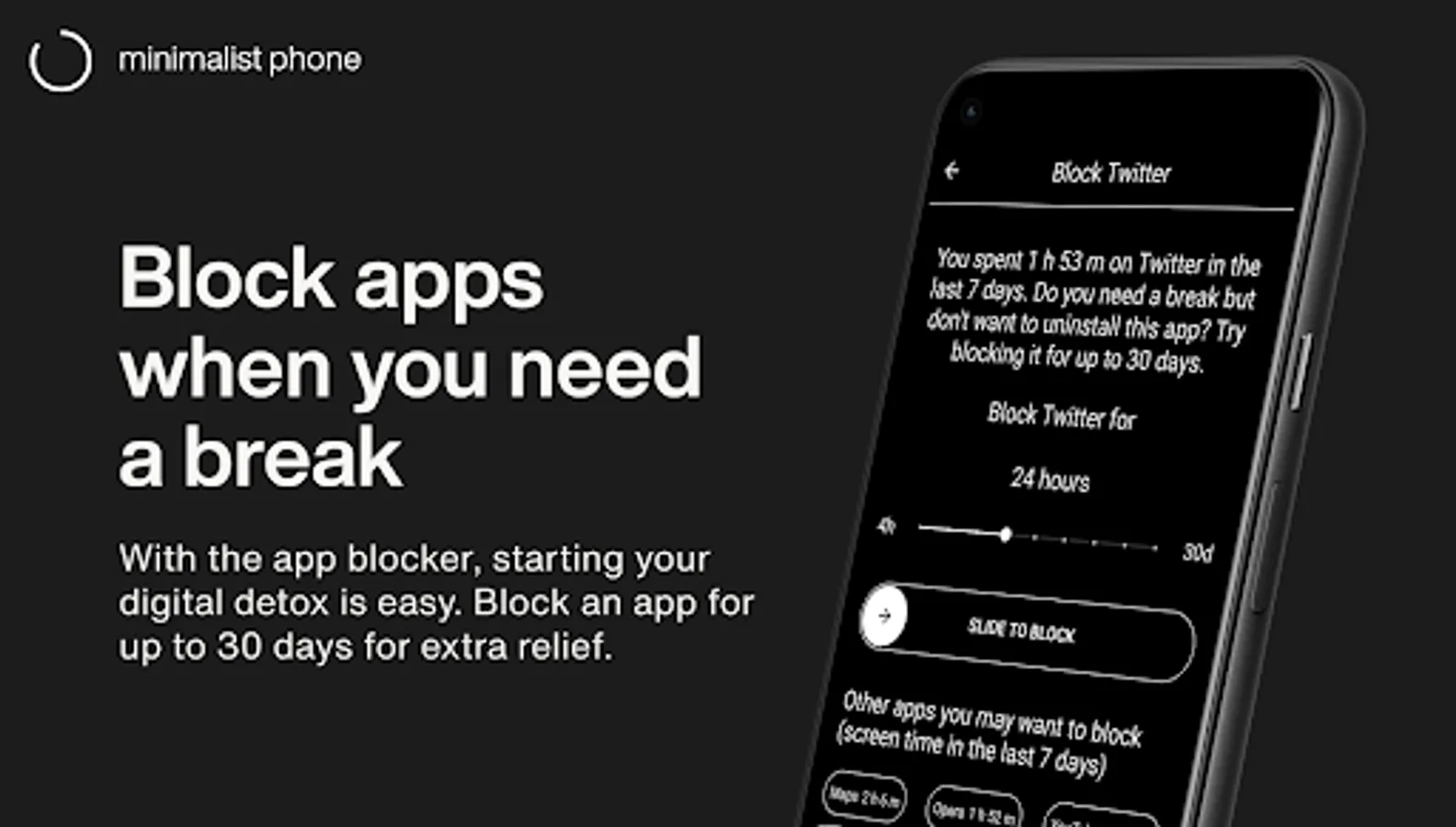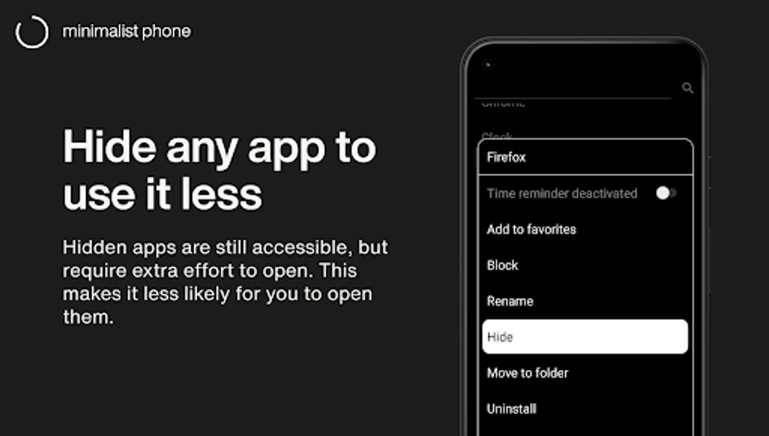 Start by replacing your current home screen (launcher) with our minimal interface. This distraction blocker helps you get your screen time and high phone use under control. Minimalist phone is more than just an app theme or home screen - hide apps, rename apps and restrict addictive apps and games on your phone.
