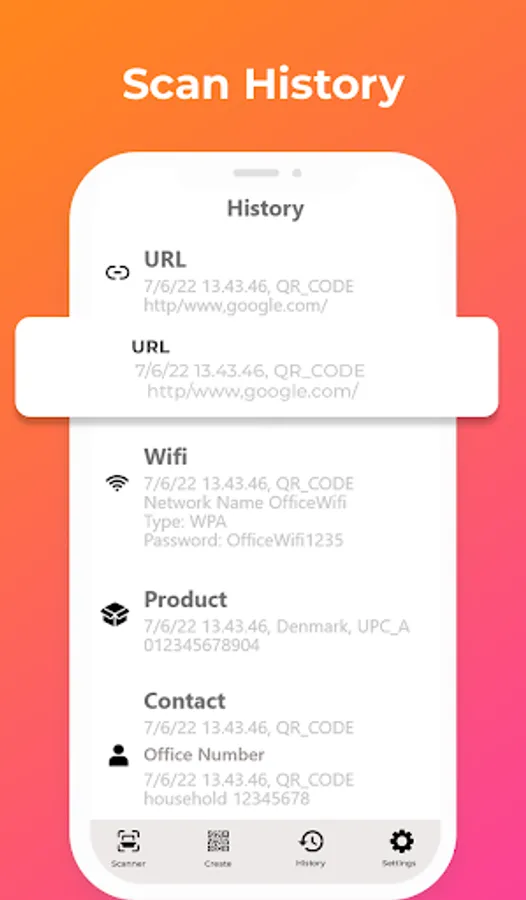 In the QR Barcode Scanner app you scan and Generate these types of QR Code some features list is mentioned below: