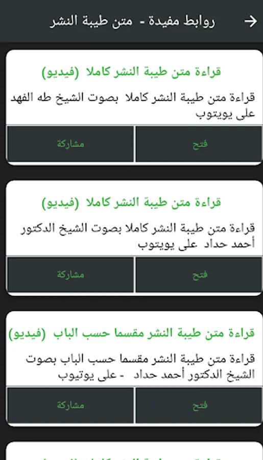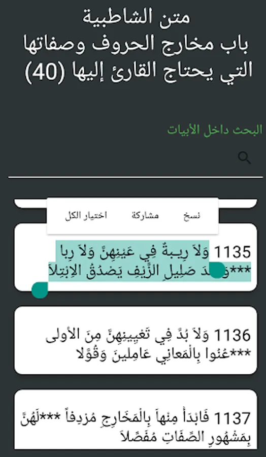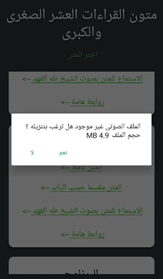تعريف موجز بالبرنامج > : تطبيق غير ربحى بدون إعلانات - تطبيق متون القراءات العشر الكبرى والصغرى هو خلاصة توفيق من الله عز وجل . يهدف التطبيق إلى التيسيير على طلبة علم القراءات وجعل المادة العلمية متوفرة فى الهواتف ويتيح البرنامج البحث داخل المتون لسهولة الوصول للمعلومة كما يتيح البرنامج أيضا الاستماع للمتون وذلك فى متن الشاطبية حرز الأمانى ووجه التهانى للإمام الشاطبى ومتن الدرة المضيئة فى القراءات الثلاث ومتن طيبة النشر فى القراءات العشر للإمام محمد بن الجزرى . كل ذلك بشكل بسيط فى شكل التطبيق واستخدامه وكأى جهد بشرى قد يكون يحتوى على خطأ أو يحتاج لنصح . ونحن نسعد باستقبال اقتراحاتكم وآرائكم عن طريق إرسال رسالة إلى صفحاتنا على وسائل التواصل أو صفحة التطبيق فى متجر جوجل أو البريد الالكترونى كما يمكن أيضا إرسال بريد الكترونى من داخل التطبيق عن طريق قسم التواصل معنا فى التطبيق . جزى الله خيرا كل من بذل جهدا فنفع الله به فى هذا التطبيق وجعله فى موازين حسناتهم وغفر لهم الرحمن ذو الفضل والمنن . والحمد لله رب العالمين والصلاة والسلام على