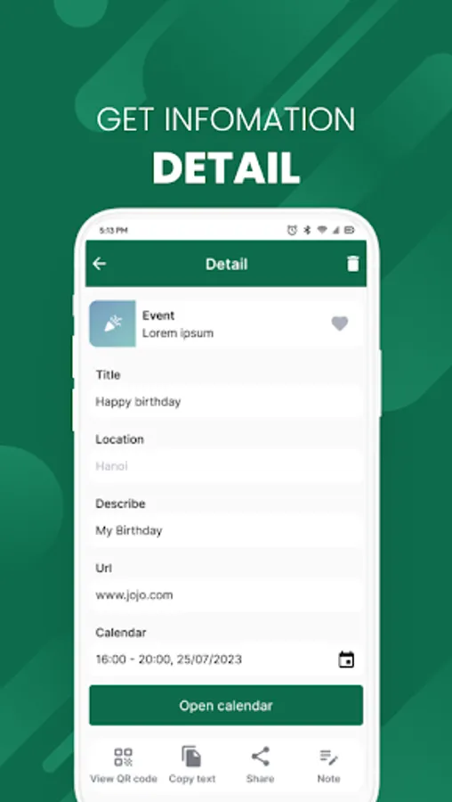 Create: contact info, email, activity, location, phone number, phone info, text, website, WiFi details.